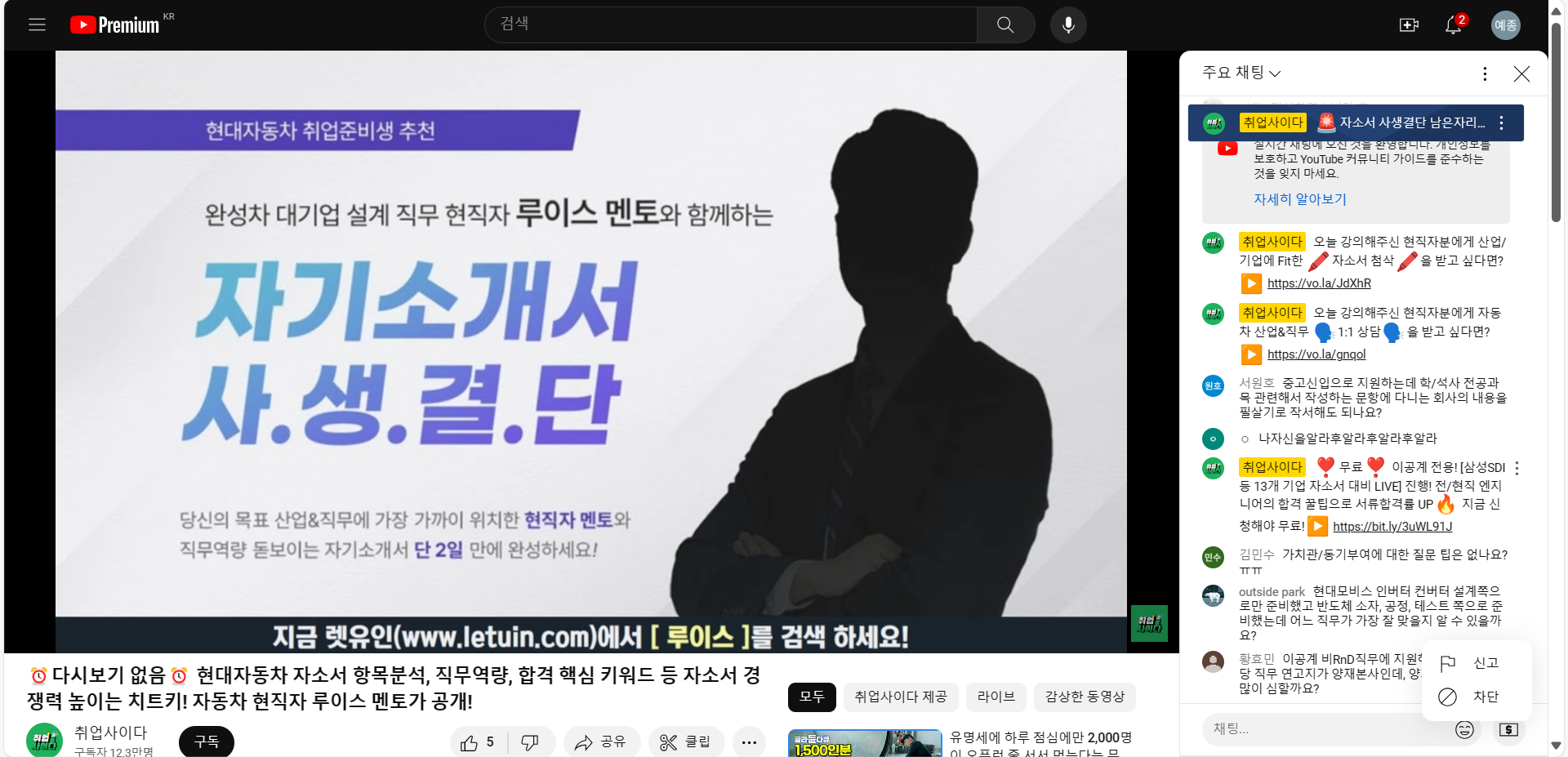 지원동기, 입사 후 포부, 성격 장단점 등 자소서 항목에 써야하는 내용들을 어떻게 써야하는지 자세하게 설명해주셔서 이해하기 좋았습니다. 생방송 시청 인증 이미지