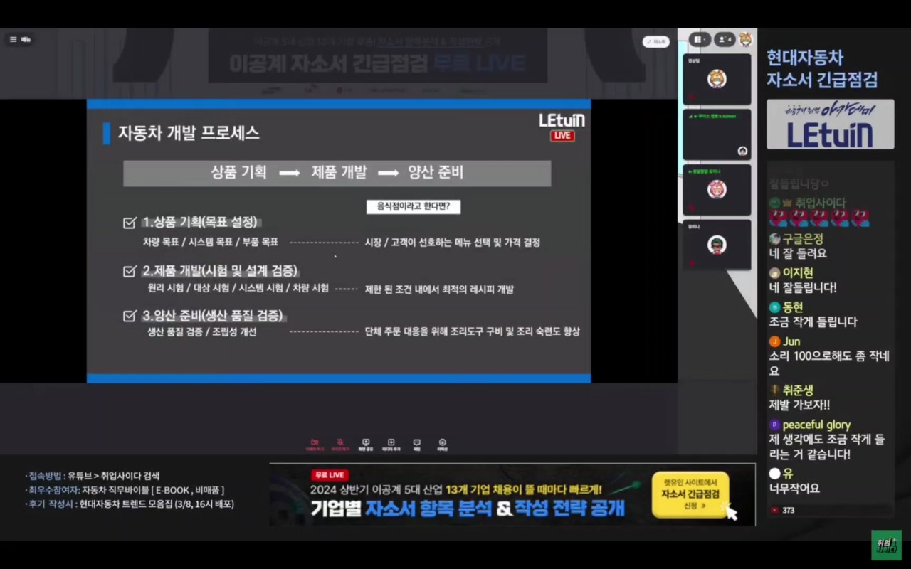 2. 자동차 개발 process와 직무 관련 설명 - 상품 기획/제품 개발/양산 준 3. 자소서 항목 분석 및 각종 팁들 4. 현직자 분과의 QnA 3. 수강후기
