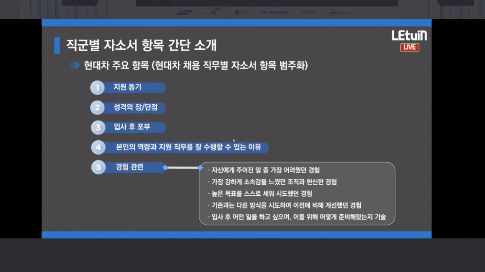 현대자동차의 자기소개서 항목의 특징으로 직무적합성에 대해 강조하는 부분이 많았는데, 해당 부분에서 타 특강들과 달리 강사님께서 단호하게 직무 관련 능력이 없다면 이를 키우기 위해 노력해야한다고 말씀하신 게 인상깊었습니다. 어떻게보면 당연한 내용이지만, 특강을 들으며 저에거 정확히 무엇이 부족한지 다시 한 번 돌아볼 수 있었던 것 같습니다.