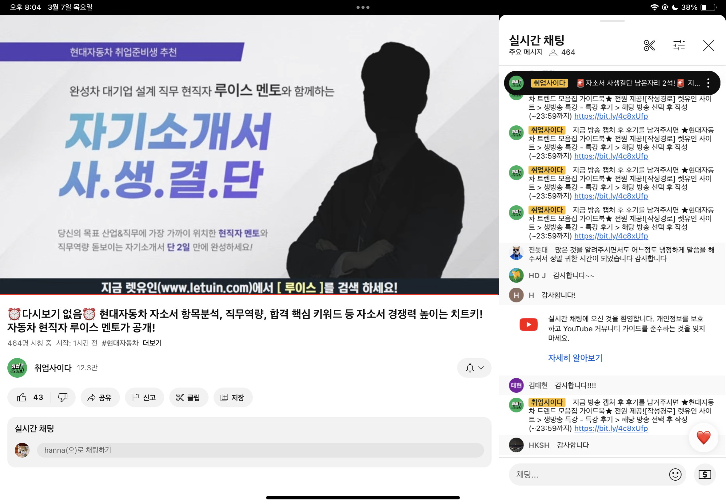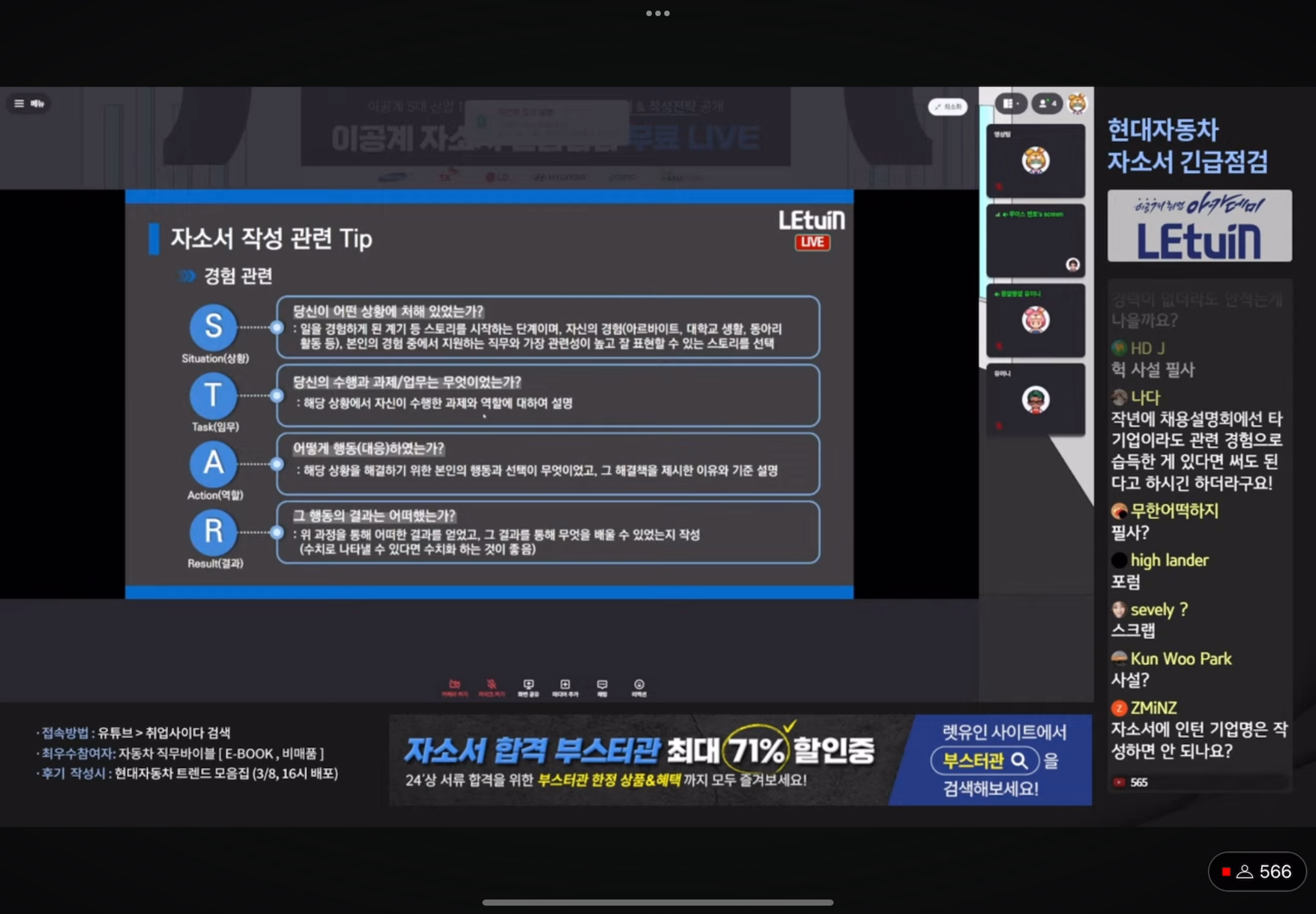 2024 자동차 산업의 동향 및 이슈와 자기소개서 문항별 작성팁까지 현대차 자소서 뿐만 아니라 타사의 자소서에도 도움되는 이야기들을 많이 해주셨습니다. 특히 잘 쓴 남의 자기소개서의 골격 구조를 벤치마킹하라는 팁이 가장 와닿았습니다.