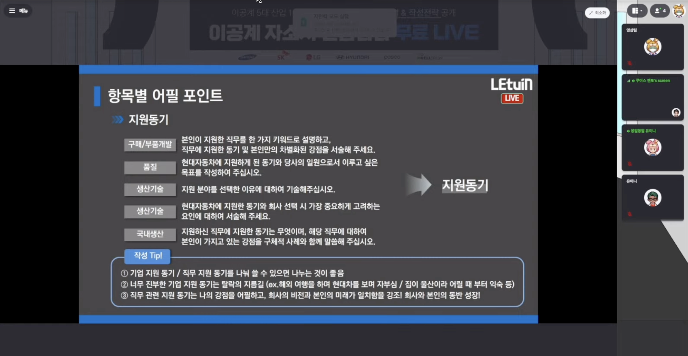 지원 전략, 직무별 특징 설명, 문항별 자소서 접근 전략, 자동차 산업의 현재 경향 및 발전 과정 등을 알 수 있었습니다. 또한, 해당 산업 발전 과정을 전자 산업과 비교하여 타 분야 자소서 작성시에도 도움이 될 수 있는 내용이라 유익하였습니다.