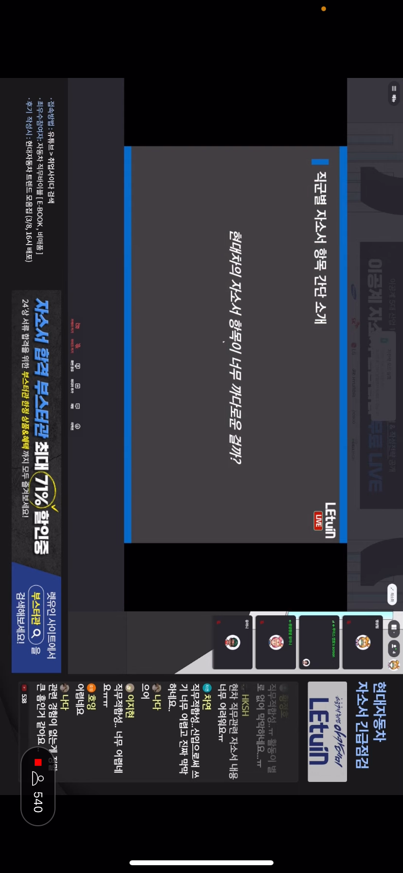 현대자동차 자소서 꿀팁을 대방출해주셨습니다. 그 내용으로는 각 직무 특징과 역량, 자기소개서에 간결하고 확실한 어필법, 자동차 산업 이슈, 채용트렌드 , 합격자소서를 보며 글의 구조 파악하며 요령을 파악했습니다.