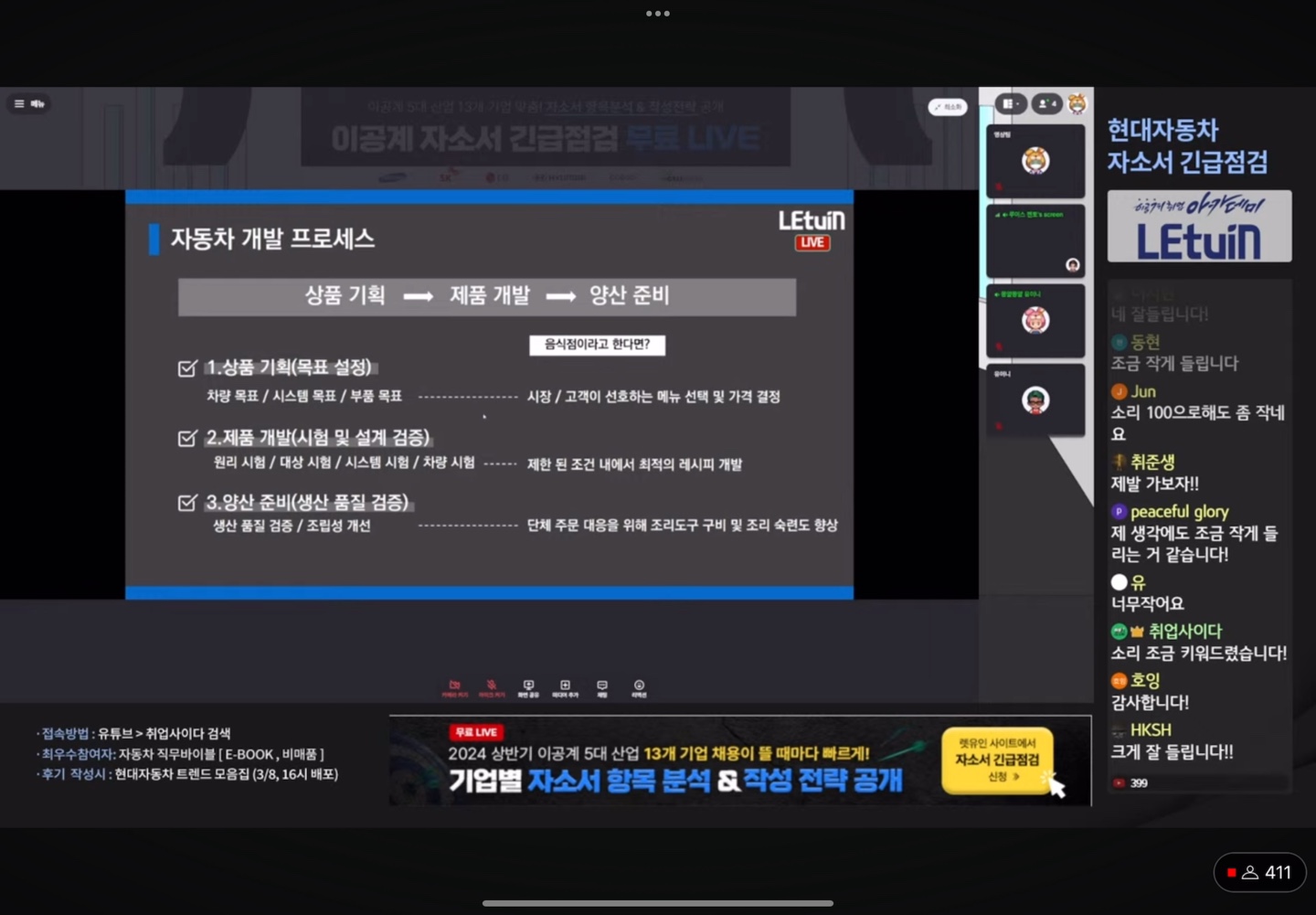 2. 금번 채용 공고 간단 소개 3. 자동차 산업 관련 최신 이슈 4. 직군별 자소서 항목 간단 소개 5. 자소서 작성 관련 tip / 항목별 어필 포인트 목차 순서로 강의 수강하였습니다. 차동차 개발 프로세스 순서를 음식점 상황과 비교하여 설명해주는 부분이 이해가 쉽게 되었고, 자소서 항목 tip을 알려주셨습니다. 3. 수강후기