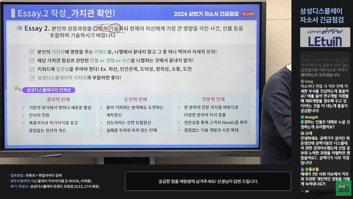 다른 회사 자소서에도 통용될 수 있는 자소서 쓰는 포인트 설명도 해주셨습니다. 특히 부서별 직무 관련 JD를 꼼꼼하게 설명해주셨습니다. 생방송 시청 인증 이미지