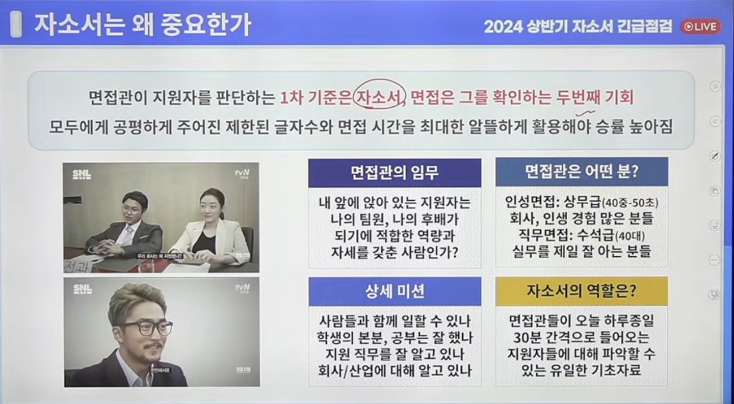 면접관이 지원자를 판단하는 1차기준이 자소서. 직무기술서 꼭 읽고 지원직무 정한다. 첫번째 문단만 읽을 것이라고 생각하고 거기에 답변 압축!! 두~세줄 정도 분량으로 압축해서 크고 작은 실수를 극복한 경험 있다면 솔직하고 담담하게 쓰자. 생방송 시청 인증 이미지