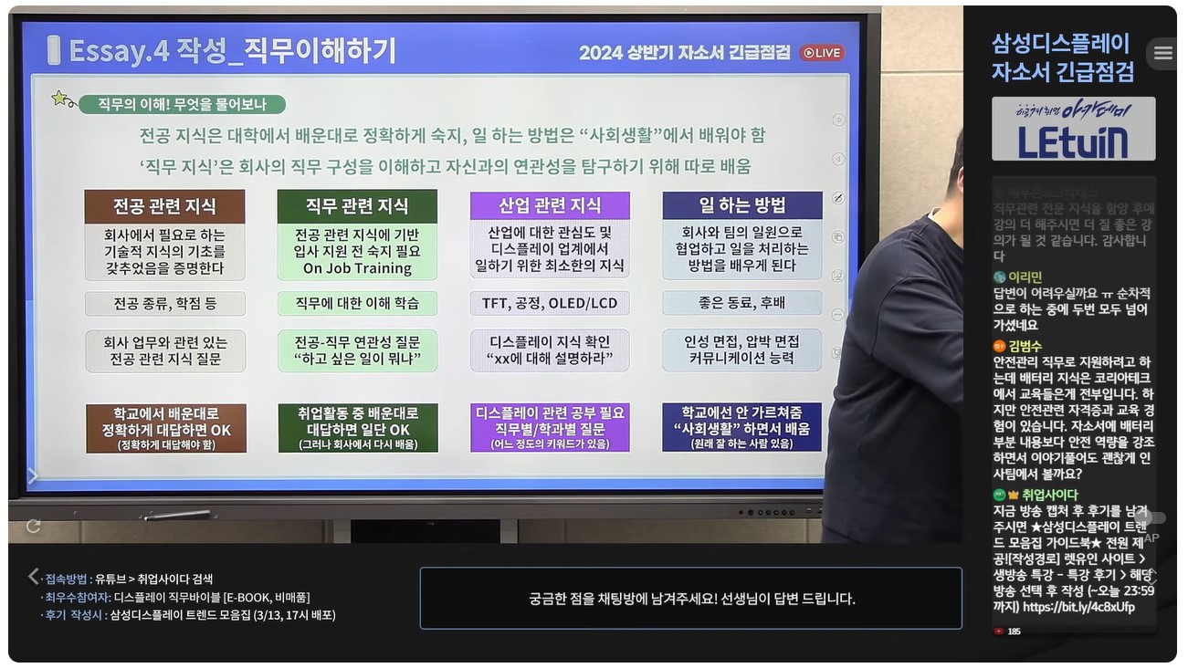 삼성 디스플레이 JD를 업무별로 분석하고 각 에세이 문항별 추천 내용과 주의사항까지 상세하게 알려주셔서 유익하고 알찬 시간이었습니다. 각 업무별 중요한 이슈들도 파악할 수 있었습니다. 감사합니다.