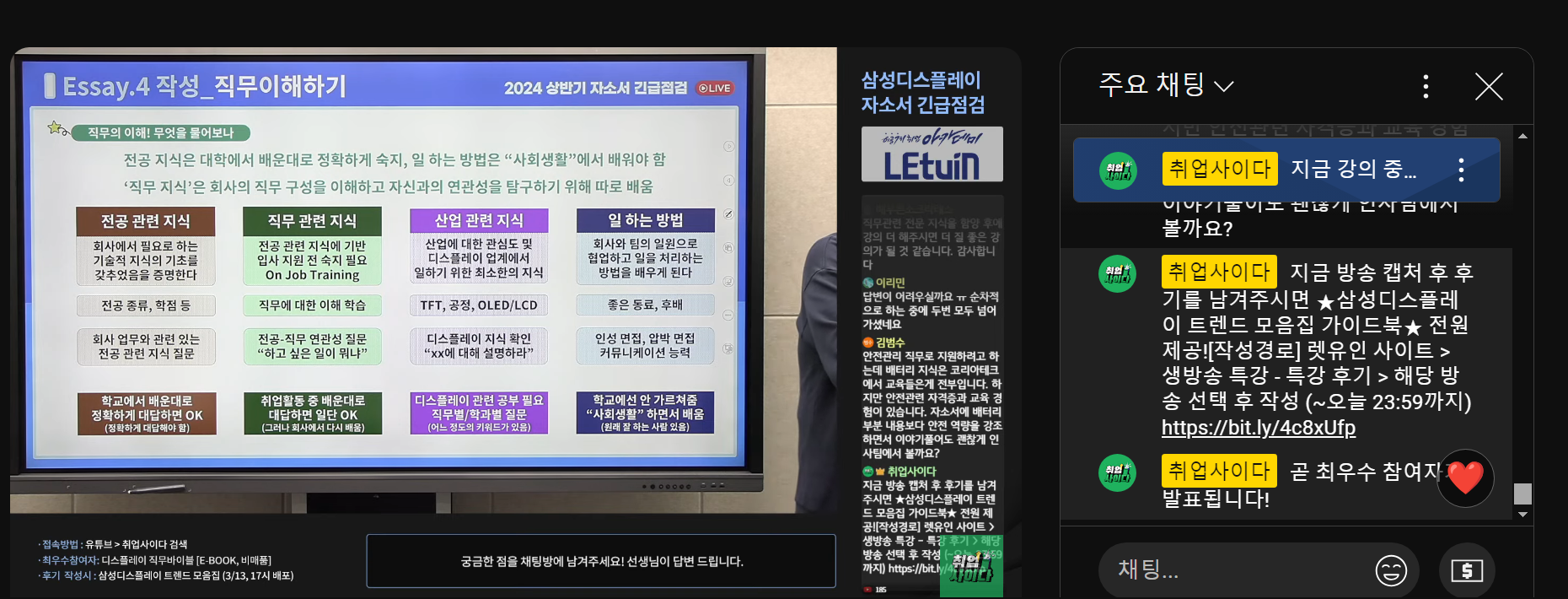 직무 설명도 단순 글이 아닌 설명 형식으로 해주셔서 보다 쉽게 이해할 수 있었습니다. 자소서 긴급점검을 듣지 않았다면 넘어갔을 내용들이 많았습니다. 이를 참고하여 더 퀄리티 높은 자기소개서를 작성할 수 있을 것 같습니다. 생방송 시청 인증 이미지