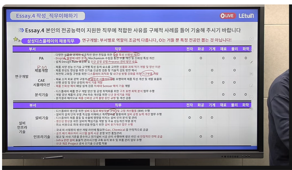 금칙어도 대부분 작성했던 것 같은데 후에 자소서 쓰면서 다시금 돌이켜보려 합니다. 삼성디스플레이 공고만 보면 직무 내용이 헷갈리는 데 덕분에 연구개발 직무에도 굉장히 다양한 부서가 존재하고, 어떤 역할을 하는지 이해하는데 도움이 되었습니다. 생방송 시청 인증 이미지