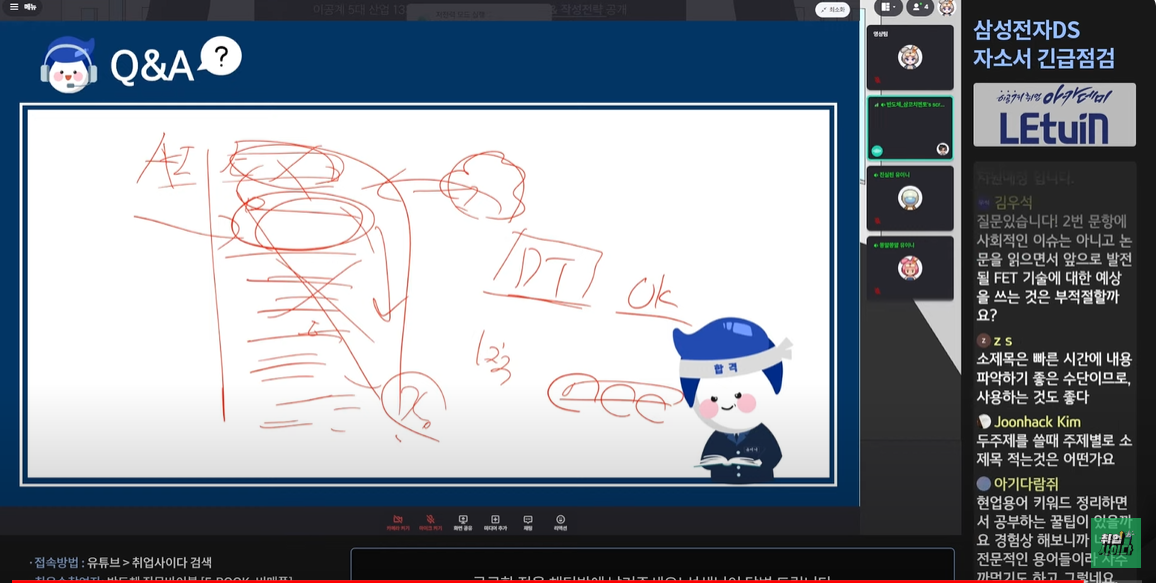 삼성전자 DS 부문 사업부 별 조직 개편 내용, 자소서 항목 분석, 직무 역량, 합격 핵심 키워드에 대한 설명이 있었습니다.