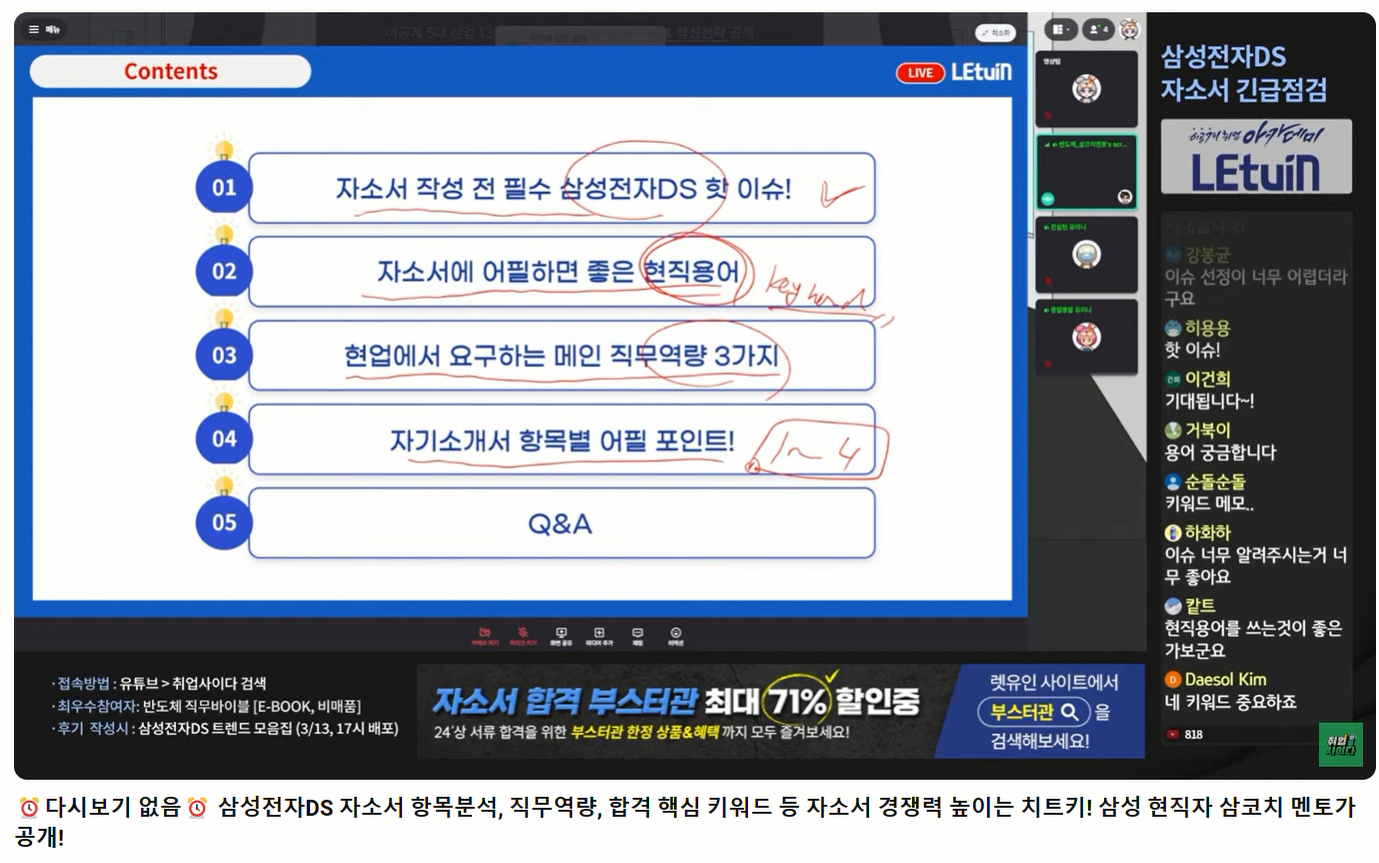 삼성전자 DS의 이슈, 현직 용어, 현업에서 요구하는 메인 직무역량, 자기소개서 항목 별 어필 포인트를 알 수 있었습니다.