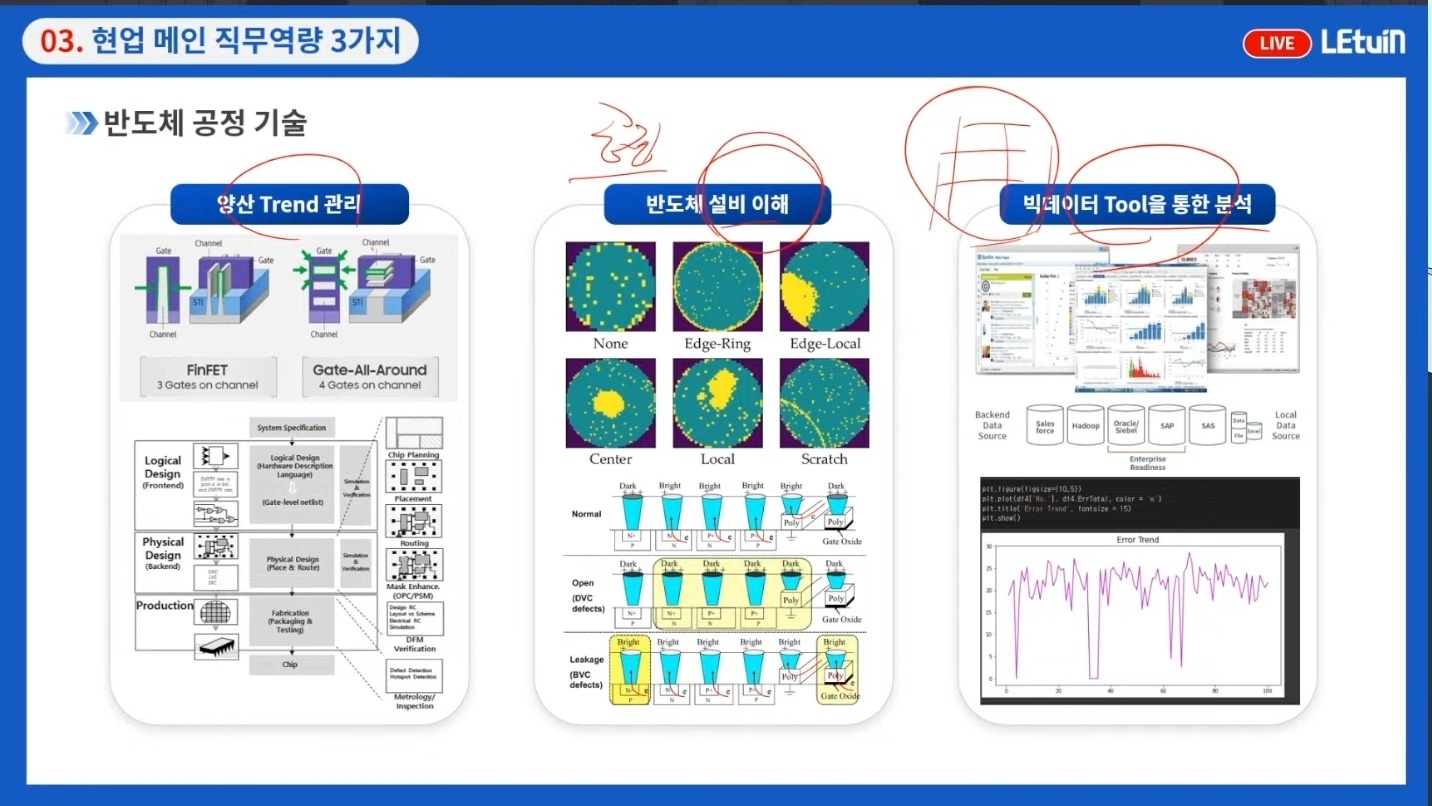 현직자의 본능 분석하기 , 각각의 사업부의 Hot Isuue, 공정기술 & 설비기술의 조직 개편 사항, 각 공정 분야의 핵심 키워드, 반도체 공정 기술이 하는 역할 크게 3가지 양산 Trend 관리, 반도체 설비 이해 . 빅데이터 Tool을 통한 분석