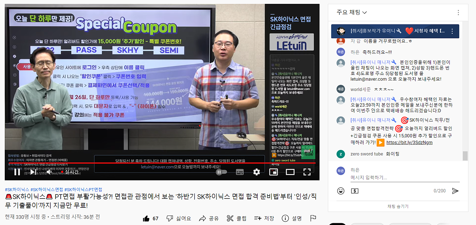 일단 대학도 정시로 들어오고, 살면서 면접경험이 이번 상반기 삼성 인턴면접 경험밖에 없던만큼 PT면접에 대한 두려움이 컸습니다. 어떤 방식으로 나오는지, PT면접을 하고 인성면접도 따로 보는지 궁금한게 많던 와중에 렛유인에서 설명회를 해주신다는 것을 알고 바로 들어가서 봤습니다. 선생님 두분 다 설명도 너무 잘해주시고 제가 궁금했던 부분들을 다 해결해주셔서 따로 더 정보를 찾아볼 것 없이 이제 면접준비만 잘 해가면 될 것 같아서 너무 감사합니다!! ※ 본 게시글은 2022.09.26 진행된 정건화, 나상무 선생님의 2022년 하반기 대비 SK하이닉스 면접 긴급점검 특강에 대하여 렛유인 카페에 남겨주신 생방송 특강 시청 후기입니다.