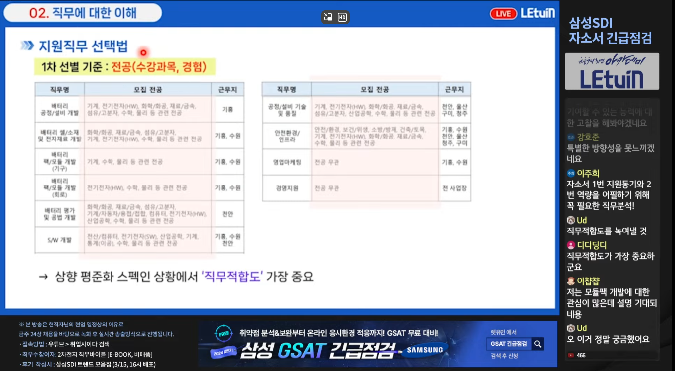 SDI 자기소개서를 작성할 때 질문 항목 별 작성 요령 및 팁 정리 SDI 관련 산업 동향(이차전지 및 전자재료) 정리 3. 수강후기