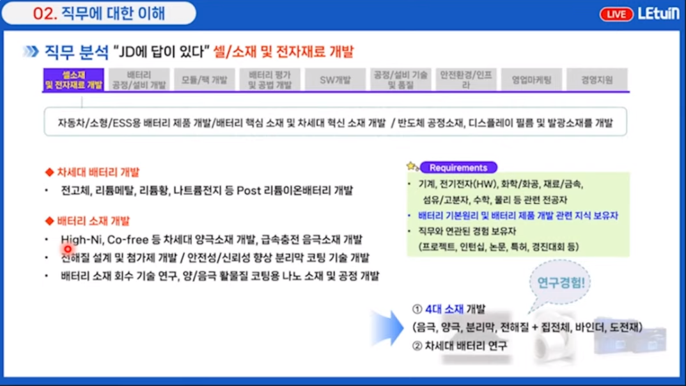 특강을 들으며 자소서부터 면접 대비까지 어떤 흐름으로 준비해야하는지 생각해볼 수 있었습니다. 특히 삼성 SDI로만 준비해야할 것이 아니라 배터리 3사를 비교하며, 삼성SDI만의 장, 단점, 전략을 준비해야겠다고 생각하게 되었습니다. 또한 자소서 문항 역시 세세하게 집어주셔서 많은 도움이 되었습니다.