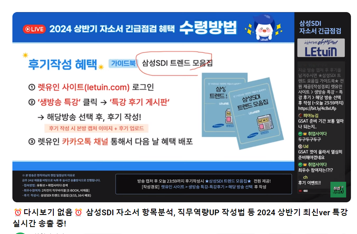 중요한 내용 위주로 간결하고 알기 쉽게 설명해주셔서 도움이 많이 되었습니다. 제 자소서에 문제점들도 쉽게 파악할 수 있었구요.. 얼른 수정해서 제출해봐야겠습니다. 감사합니다!! 생방송 시청 인증 이미지