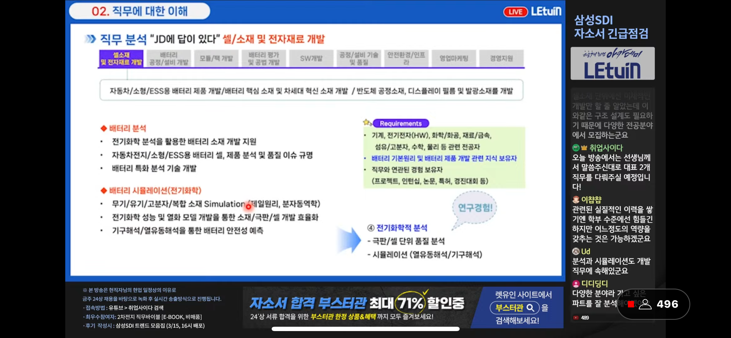 녹화강의로 이루어졌지만 차분하고 자세한 설명을 통해 원하는 정보를 얻을 수 있었습니다. 자기소개서 작성하는 것이 막막했는데 각 항목당 가장 중요한 부분을 배워 조금 더 수월하게 작성할 수 있겠다고 생각했습니다. 삼성 SDI 뿐 아니라 LG와 SK 각각의 전략을 모두 비교분석하는 것이 가장 중요하다고 생각합니다.