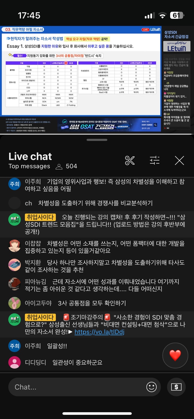 자기소개서 마감 기간이 얼마 남지 않은 시점에서 정말 중요했던 핵심을 다시 한번 상기시키고 어떻게 수정하고 내용을 담으면 좋을지에 대한 방향을 뚜렷하게 잡은 기회였습니다. 특히 국내 3사와의 공통점과 차이점을 한번에 볼 수 있는 표를 제시해주셔서 삼성SDI만의 차별점을 다시 한 번 확인할 수 있는 기회가 되지 않았나라는 생각이 듭니다.