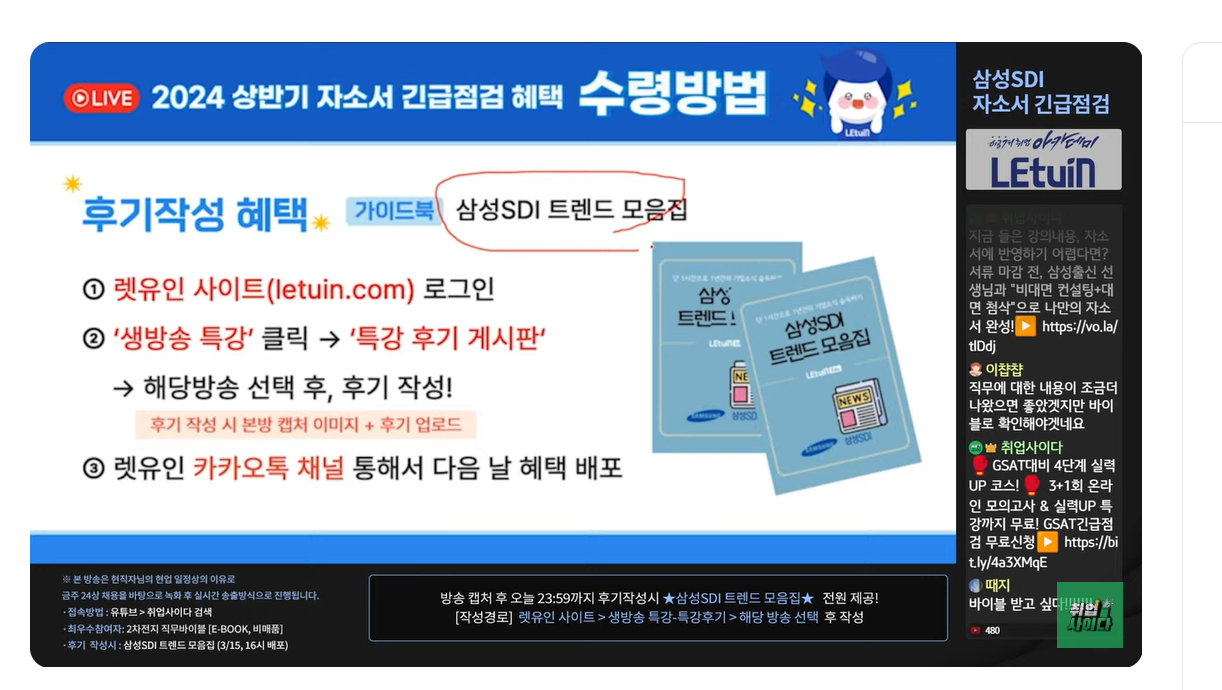 삼성SDI에 대한 설명과 사업전략을 설명해주어서 좋았습니다. 특히 산업이슈를 설명해주고 다른 기업과 비교를 해주신 점이 좋았습니다. 또한 ㄱ각 자소서 형목별 키포인트를 알려주어서 좋았습니다.