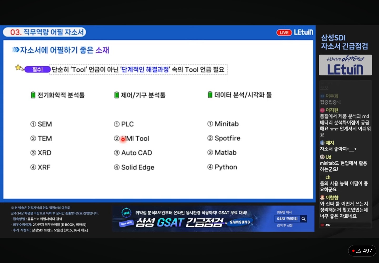 배터리 분석 직무에 사용되는 기기들을 구체적으로 알려주시고 자소서 항목별 포인트를 너무 잘 짚어주셔서 자소서 수정에 너무 도움이 될 것 같습니다. 그리고 삼성sdi와 다른 경쟁사간의 차별점도 언급해주셔서 자소서에 잘 녹일 수 있을 것 같습니다.