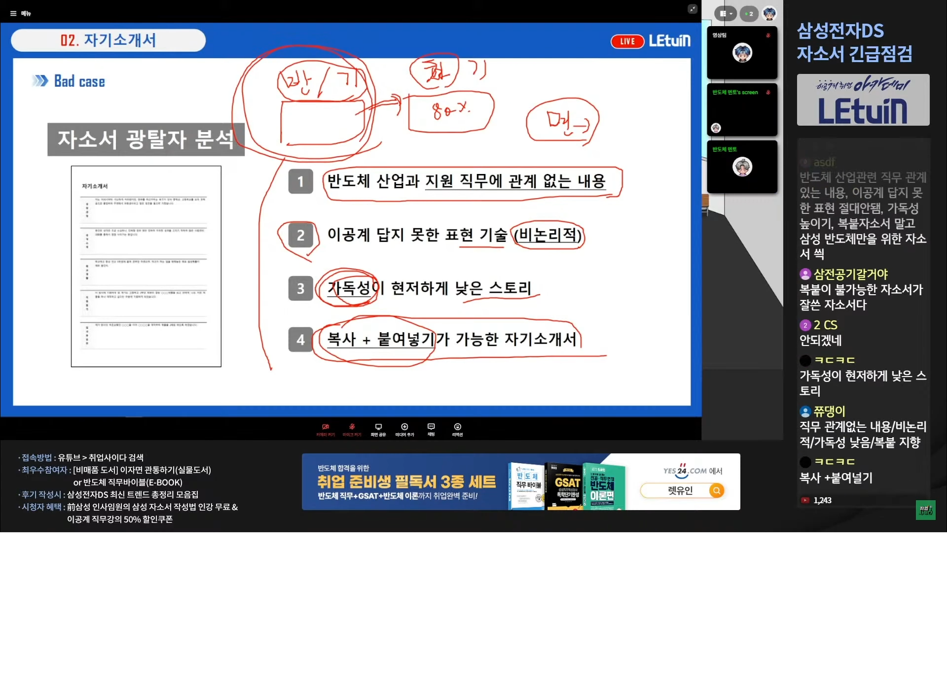 1. 2. 구체적으로 적고 키워드를 적고 직무와 관련되게 자소서 작성을 해야한다. 3. 자소서 특강을 통해 어떤 방식으로 적을지 파악할 수 있었습니다. 감사합니다.