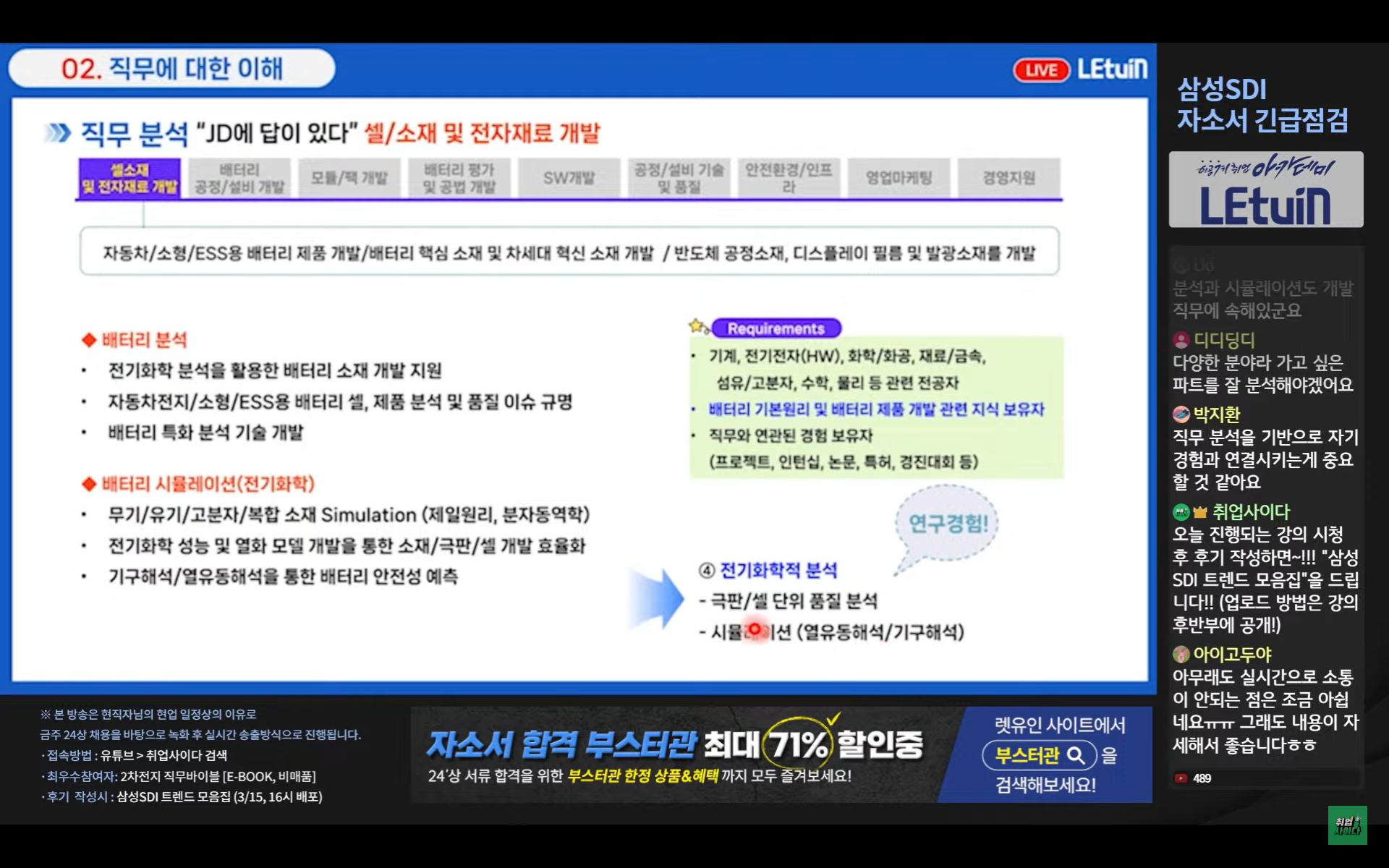배터리 회사를 지원할 때 그 회사의 정보만 작성하는 것이 아니라 다른 회사도 분석하여 지원하는 회사만의 특징을 자소서나 면접에 잘 녹아내게 하는 것이 중요하다는 말씀이 가장 기억에 남았습니다. LG 엔솔이나 SK 온 말고 삼성 SDI만의 특징을 숙지하여 자소서를 작성하겠습니다!