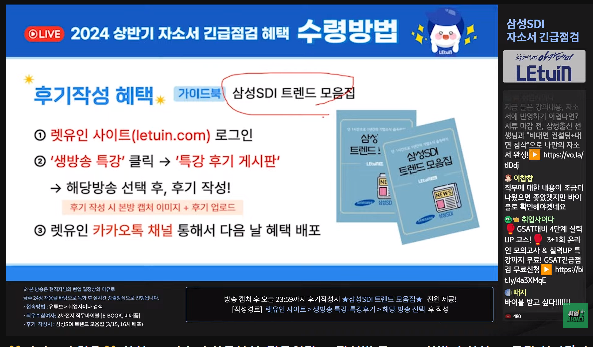 삼성 SDI 의 자소서 1번 2번 항목에 대한 대비와 개발 직군의 경우 어떤 것을 주로 다루고 있는지 그리고 어떤 연구를 진행해서 교차점이 있는 부분에 한해서 어필하면 좋다는 점에대해 설명을 들었고 엔지니어 직군의 자소서 항목에서 툴을 다뤄봤다는 점을 자기만의 논리 안에 녹여내라는 설명을 진행하셨습니다!