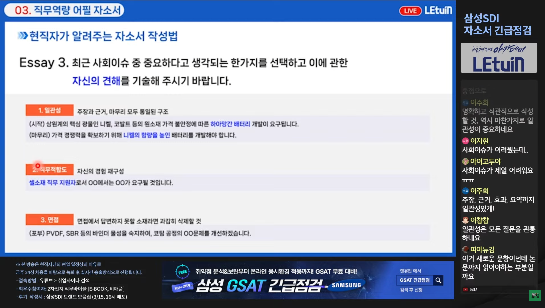 에세이별로 회사에서 요구하는 부분을 잘 알게 되었다. 3사의 공통점 및 차이점을 숙지해야 된다는 것을 알게 되었다. 역량을 과정 중심으로 서술하라는 점이 좋은 팁이었다. 직무를 설명해 주셔서 좋았다.