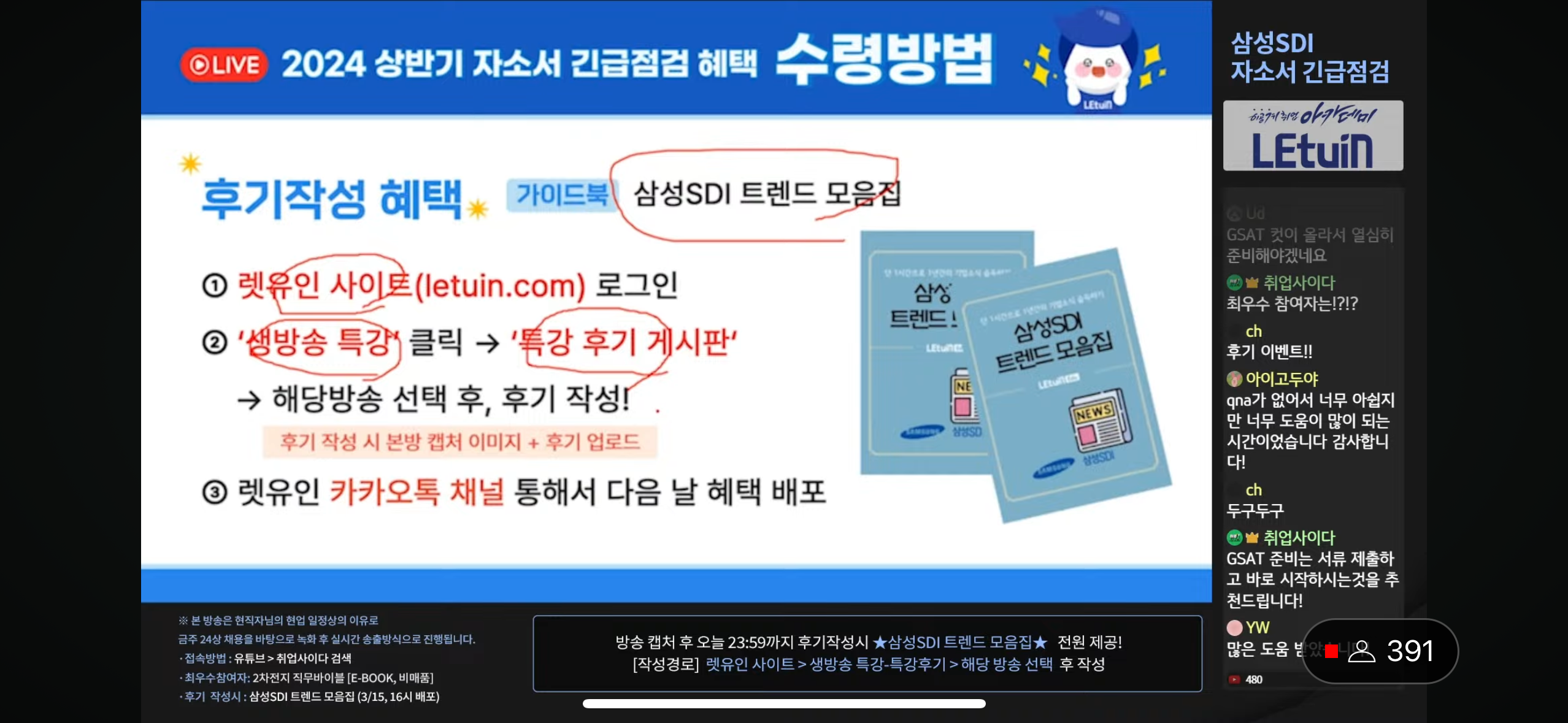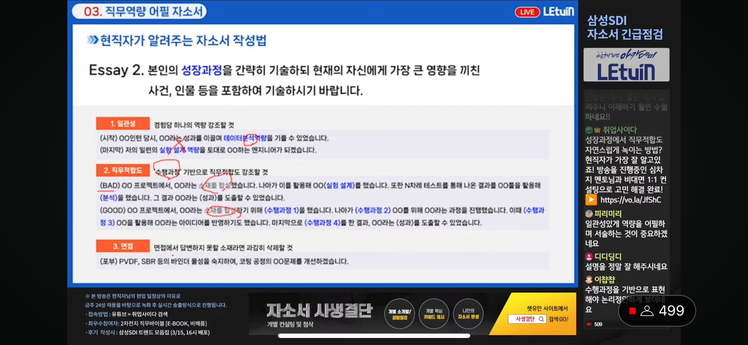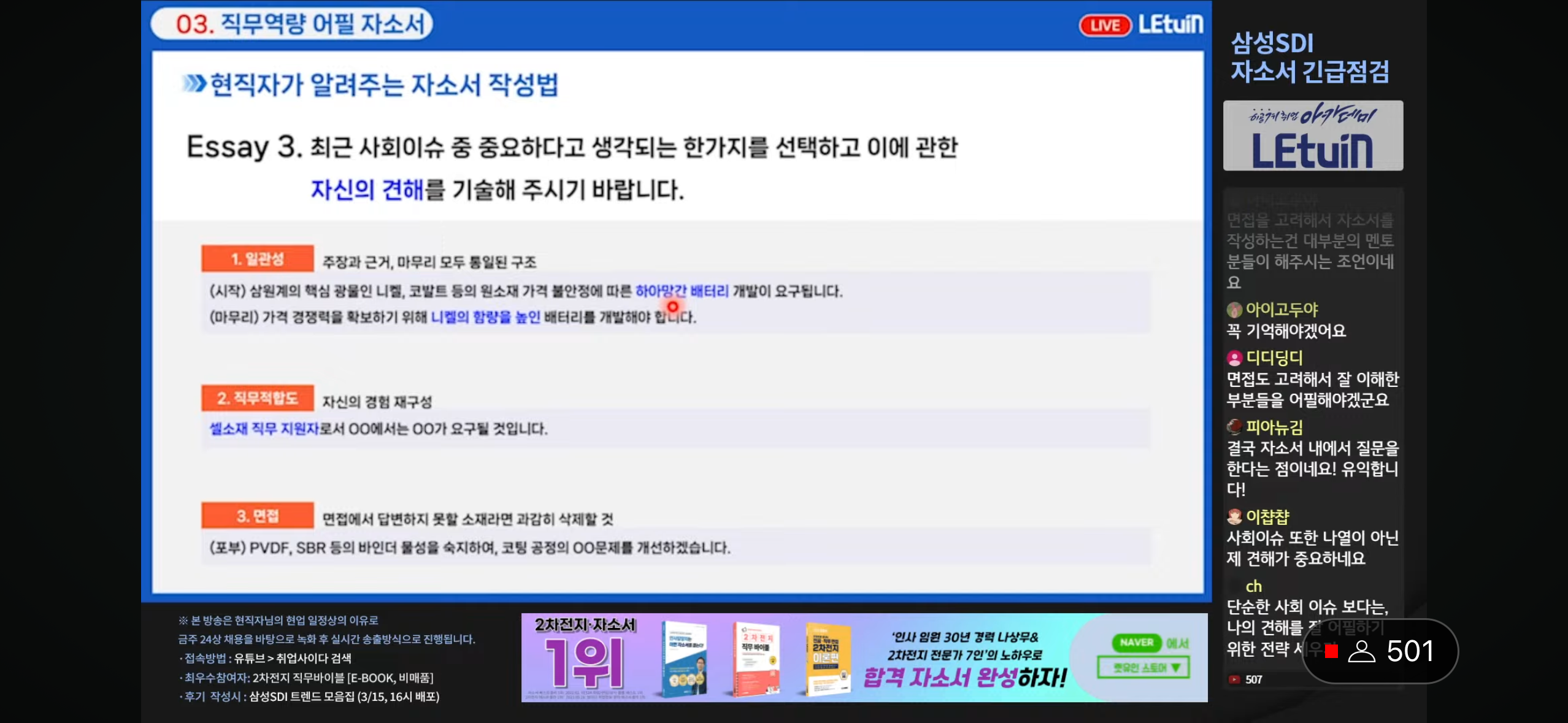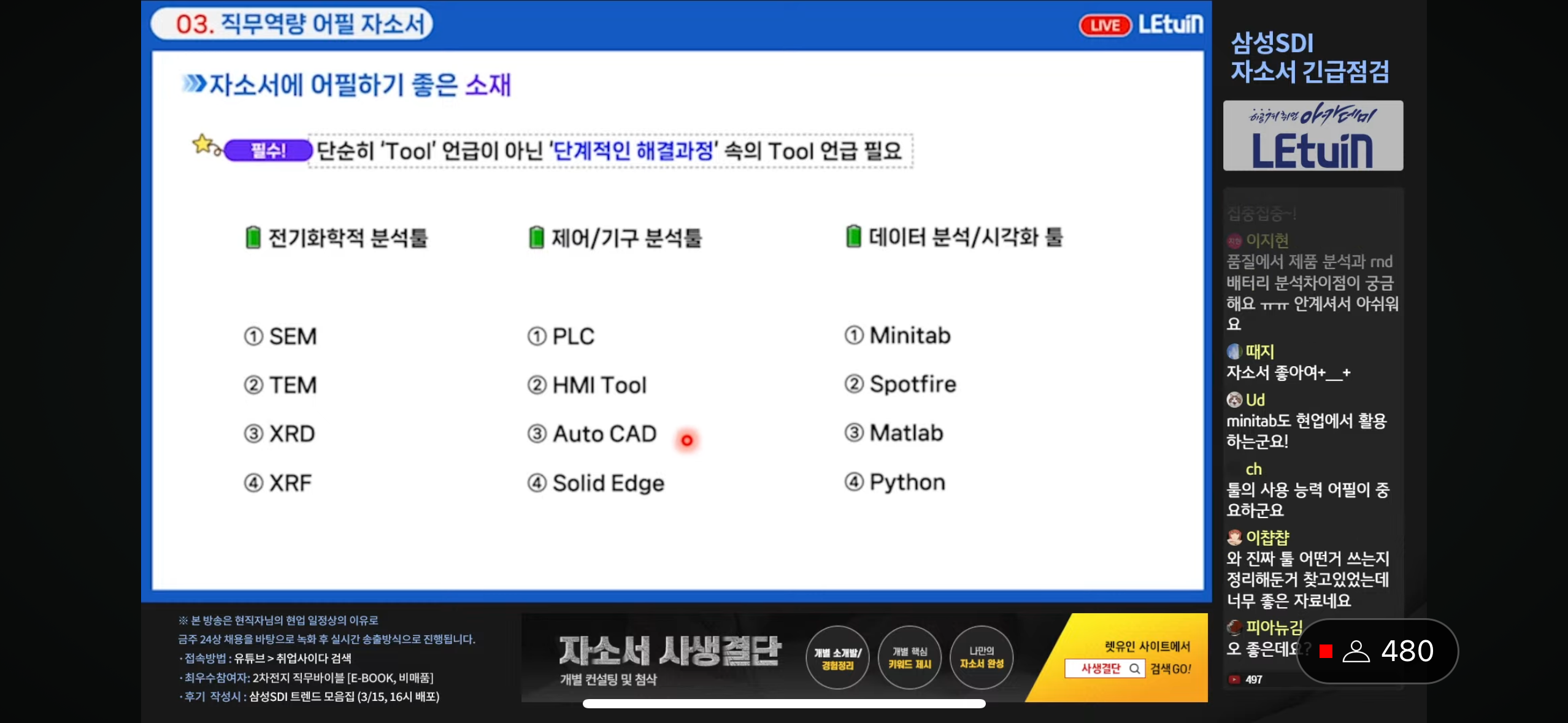 삼성 sdi에 지원하고 싶었는데 어떤 식으로 자소서를 써야 하는지 막막했는데 이번 특강을 듣고 나서 어떤 방식으로 써내야 하는지 갈피를 잡을 수 있었습니다. 그리고 sdi의 최신 산업과 직무 관한 내용들이 있어 자소서와 면접 때 도움이 될 거 같습니다.