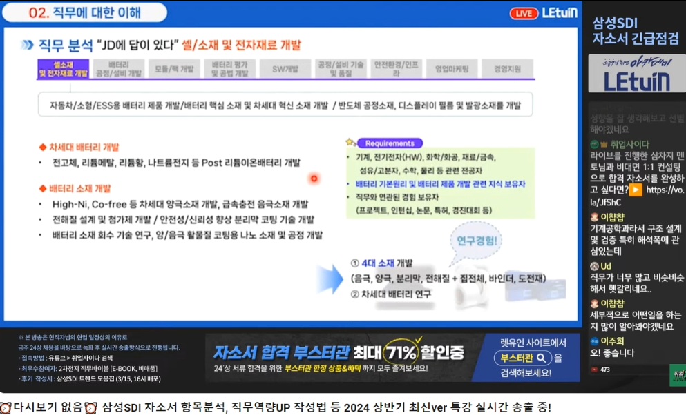 삼성SDI의 전략 2차전지 지원자가 알아야 할 최소한의 지식 지원직무 선택법 직무분석하는 방법 자소서 항목별로 틀을 제시하면서 작성하는 방법 제시 3. 수강후기