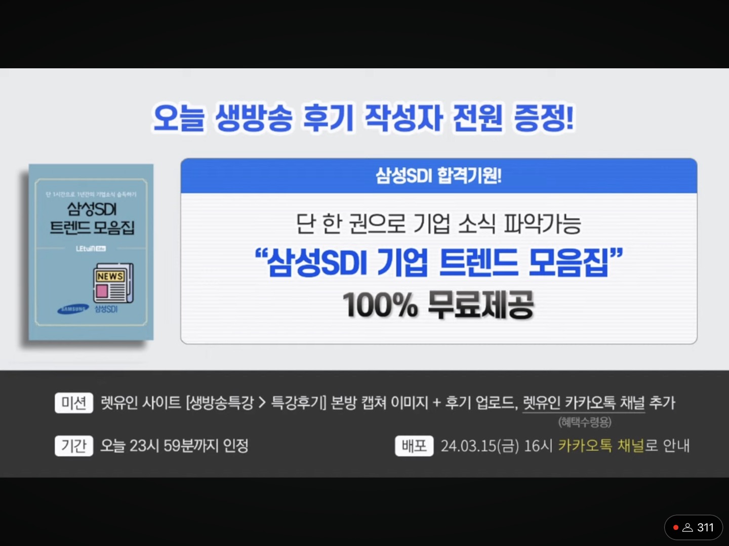 특강은 총 3개의 챕터로 삼성SDI 산업 이해, 직무 역량 어필 및 직무적합도 강조 자소서 작성법으로 진행되었습니다.