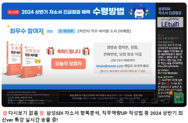 삼성SDI 기업과 산업의 이해 / 지원 직무 이해 및 직무 역량 어필법 / 직무 적합도 강조 자소서 작성법 위와 같은 구성으로 삼성SDI 자소서 준비를 위한 방향성을 알려주셨습니다. 3. 수강후기