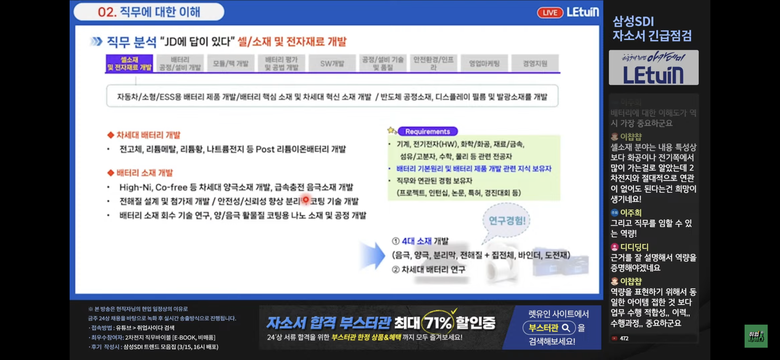 덕분에 자소서를 확실히 어떤 방향성을 가지고 만들어가야 할 지 깨달았습니다. 게다가 기업비교 및 중요 품목들을 조금이라도 알려주셔 자세히 기업 분석할 틀을 잡을 수 있었습니다. 생방송 시청 인증 이미지