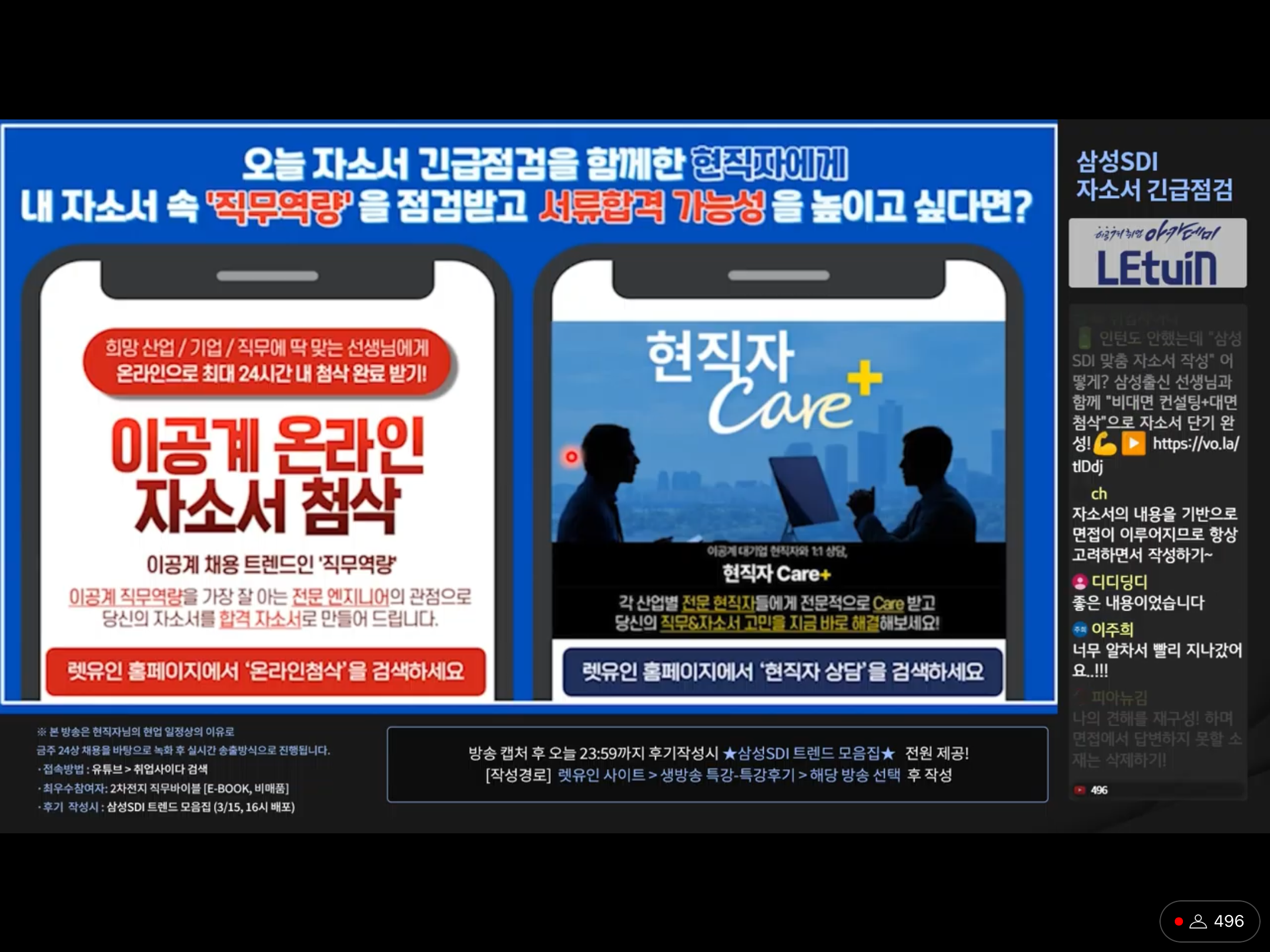 자소서가 늘 어렵다고 생각했고, 나름대로 쓰려고 노력해왔는데 제가 생각하지 못한 부분을 강조해야함을 알게 되어 유익한 시간이었습니다. 예시를 들어 설명해 주신 점, 또한 어필하기 좋은 소재를 정리한 피피티로 설명해주셔서 이해하기 쉬웠습니다. 생방송 시청 인증 이미지