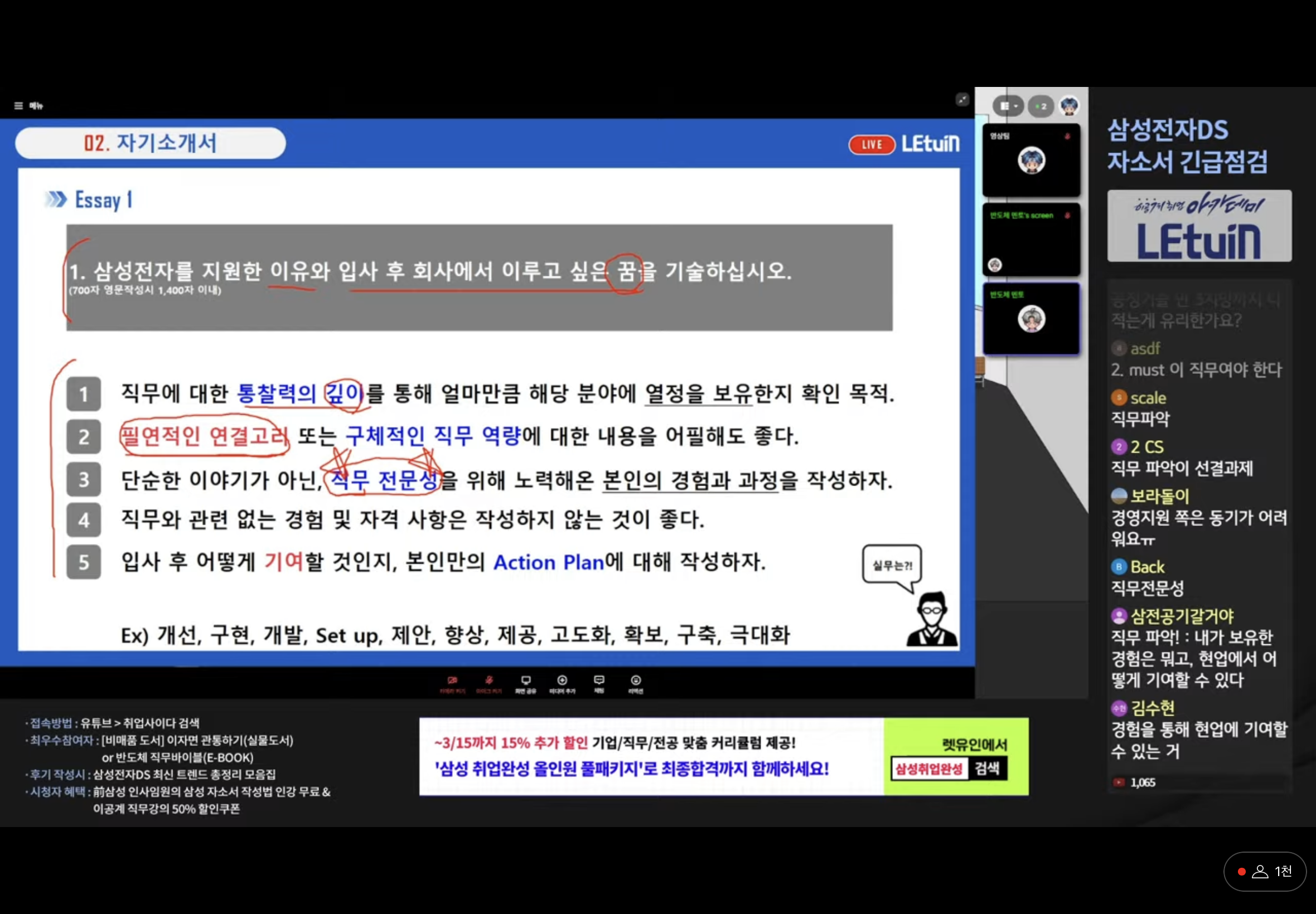 일주일도 안남은 지금 이제서야 직무 분석을 시작하려고 하였는데! 강사님이 질문 하나하나에 대한 분석을 다 해주셨고 어떤 방향으로 써야하는지에 대해서도 모두 다 자세히 말씀해주셨다! 이제 시작하는 나로써 굉장히 많은 도움을 받은 강의였던 것 같다!