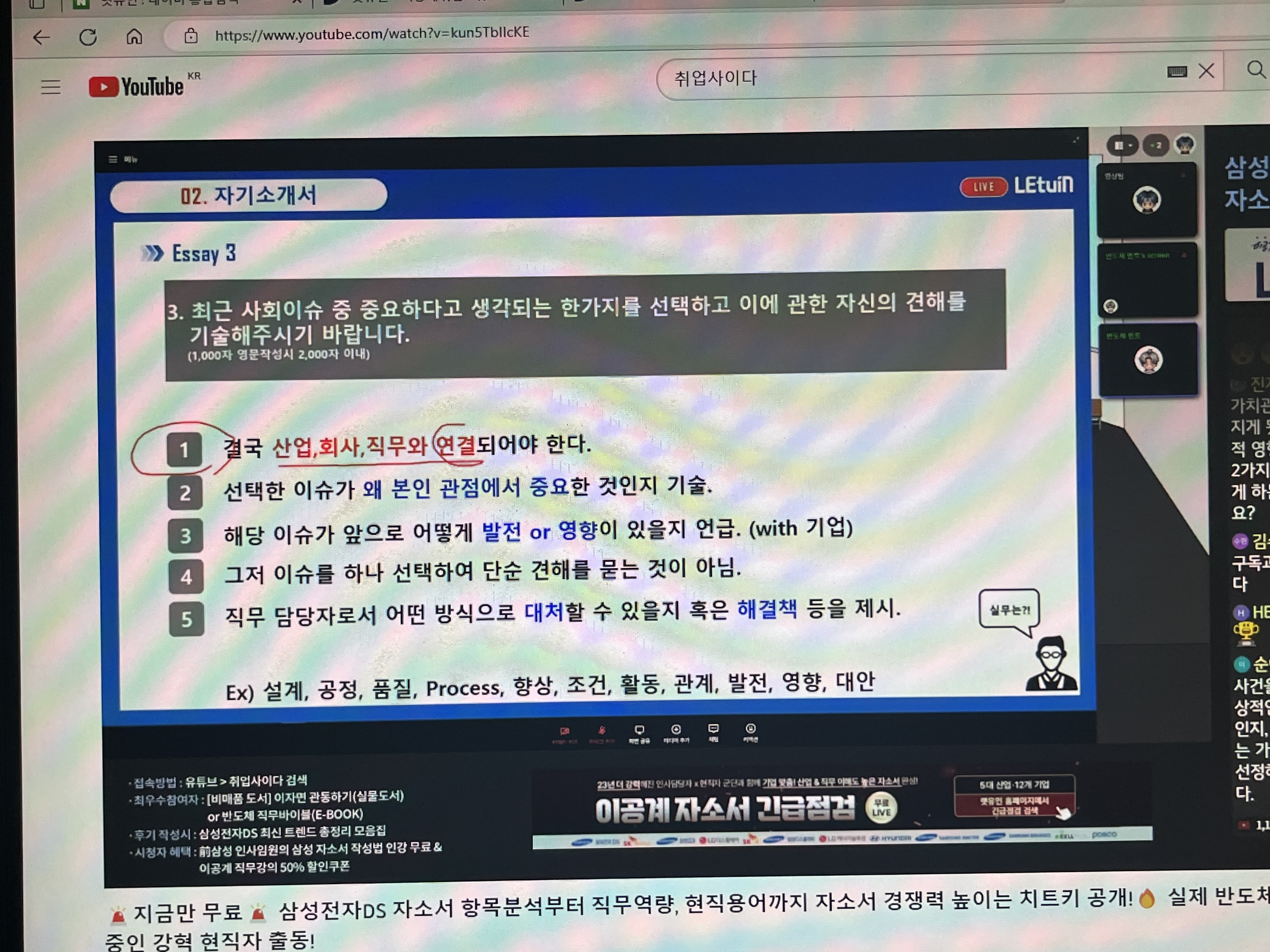 일단 무료로 들을 수 있도록 기회 주신 렛유인 분들과 강사님 너무나도 감사드립니다! 끝 부분에 Q&A 시간에 강의가 다 끝났음에도 불구하고 추가로 질문 받아주신 점도 너무나도 감사했습니다. 저도 열정을 느끼며 파이팅하는 마음을 가졌습니다!! 전반적으로 알려주신 내용과 함께 열심히 써서 최종합격 하도록 하겠습니다!! 감사합니다!!