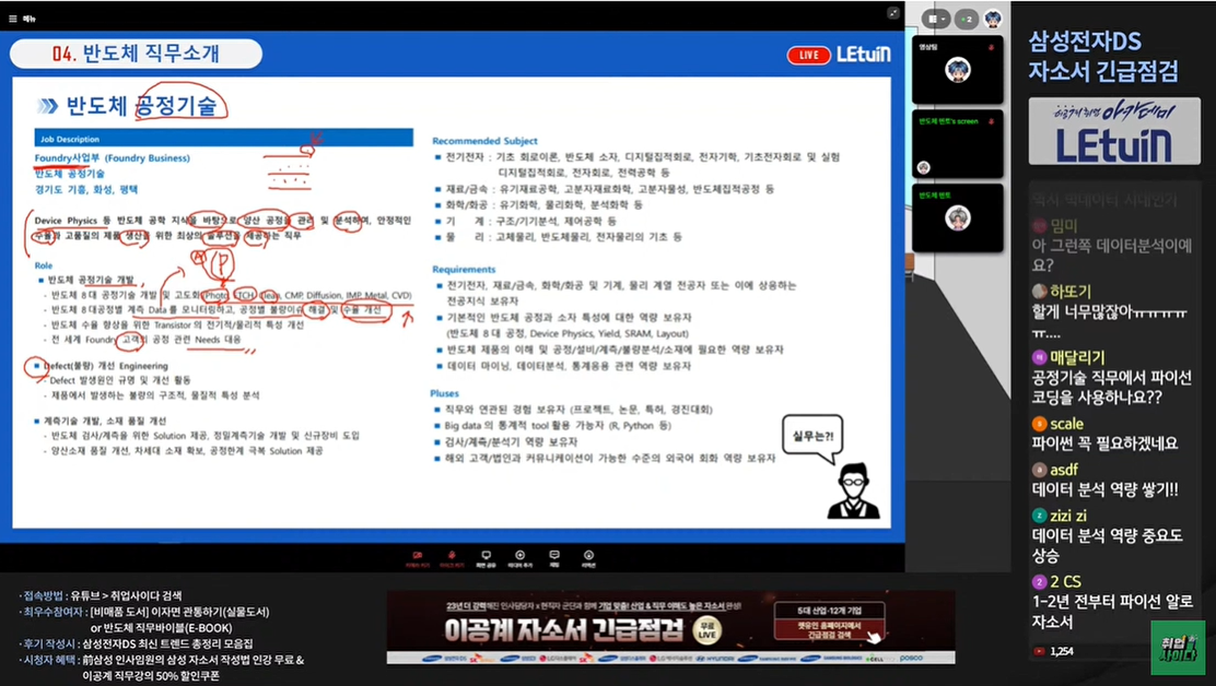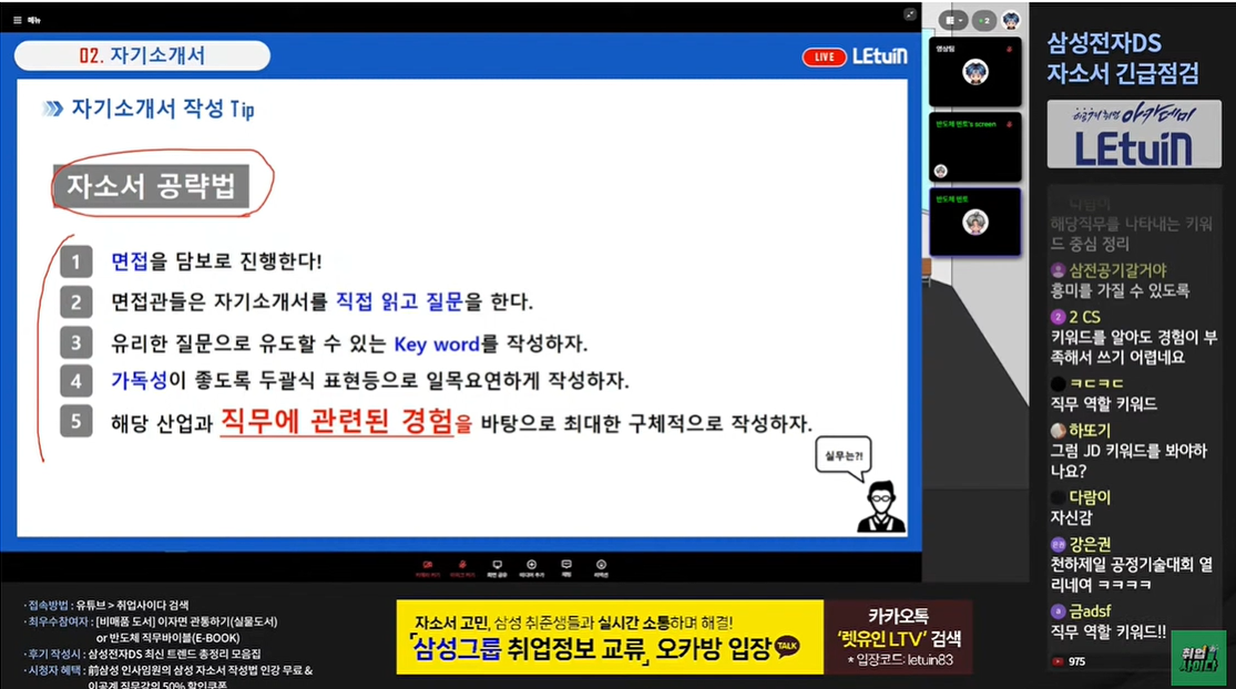 2. 강의내용 지원 이유 포부를 작성할 때 이 직무여야 한다는 필연적인 연결고리를 사용하자. 직무와 직접적으로 연결되지 않는 자격 사항은 작성하지 않는 것이 좋다. 내가 이 직무와 직접적으로 관련된 경험을 쌓고 심사하는 입장에서 이 사람을 뽑아야겠다는 생각이 들도록 작성해야 한다. 무엇보다 직무 경험이 제일 중요하며 영어 점수를 올리는 것보다 직무에 대한 역량을 쌓는 것이 올바른 우선순위 정리이다. 3. 강의 느낀점 직무 역량이 얼마나 중요한지 강조하시는 점을 보고 저의 공정설계 관련 직무 경험을 정리해야겠다는 생각이 들었습니다. 자기소개서 일정이 확정되면서 괜한 불안감에도 멘토님께서 지금부터 그럼에도 불구하고 준비하면 된다고 격려해주셔서 힘이 됐습니다. 끝까지 질문에 최대한 대답해 주시려고 하는 모습이 인상깊었습니다.
