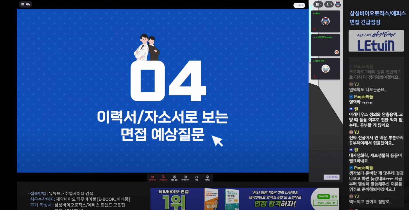 면접에서 어떤 유형의 문제가 나오고 각 문항별 전략을 알려주셔서 면접 준비를 수월하게 할 수 있을 것 같습니다. 뿐만 아니라, 최근 삼바에서 관심 갖는 사업이 무엇인지도 간략하게 소개해주셔서 도움이 많이 됐습니다.