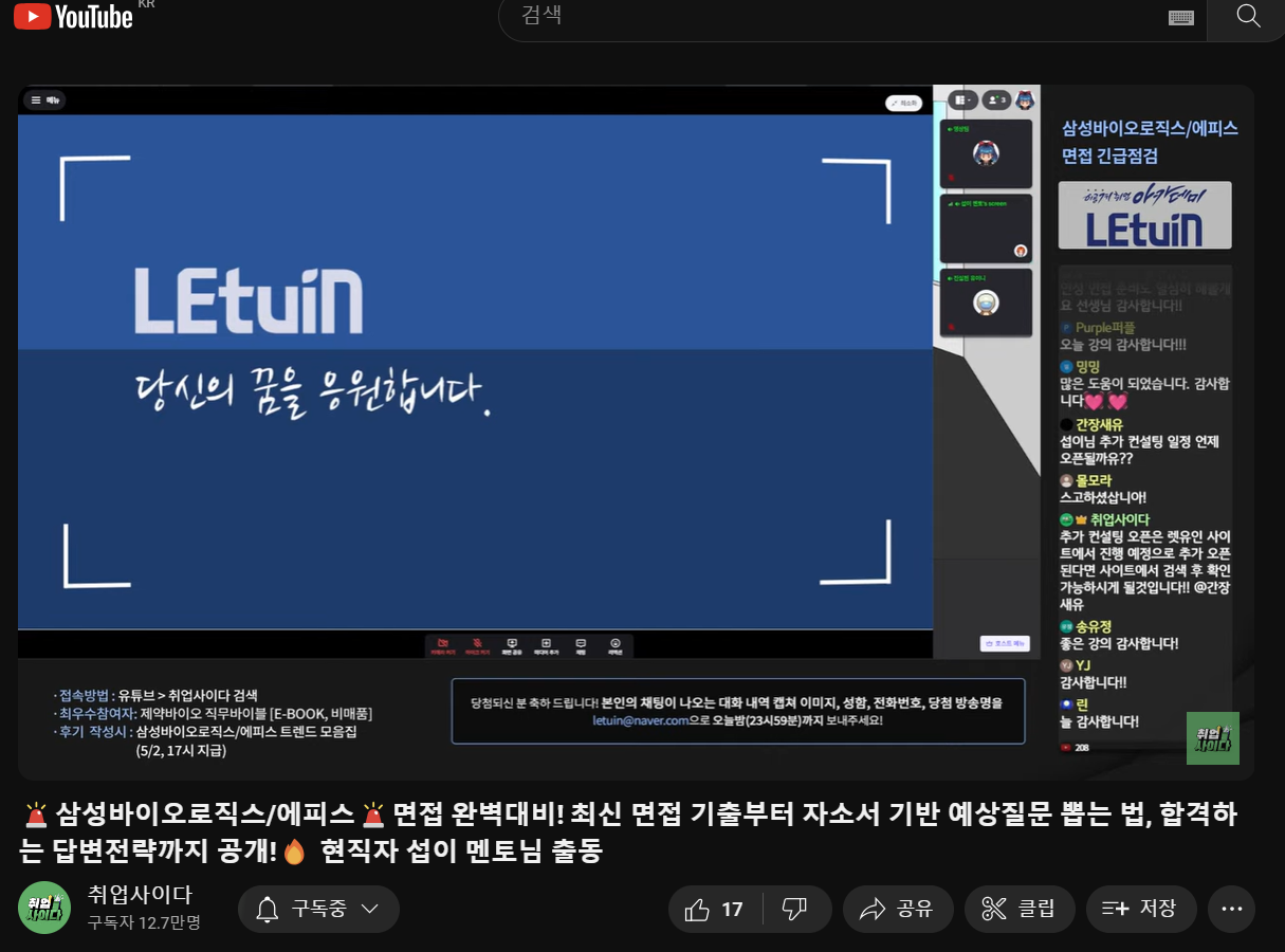 전공면접 및 인성면접 관련 준비사항을 깨닫고 열심히 준비해보도록 하겠습니다. 친절하게 설명해주셔서 감사합니다 생방송 시청 인증 이미지