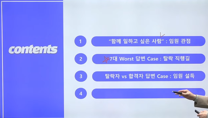 2. 7대 worst 답변 case: 탈락 직행길 3. 탈락자 vs 합격자 답변 case: 임원 설득 4. Q&A 의 순서로 진행되며 각 주제에 대한 설명을 들을 수 있었습니다. 3. 수강후기