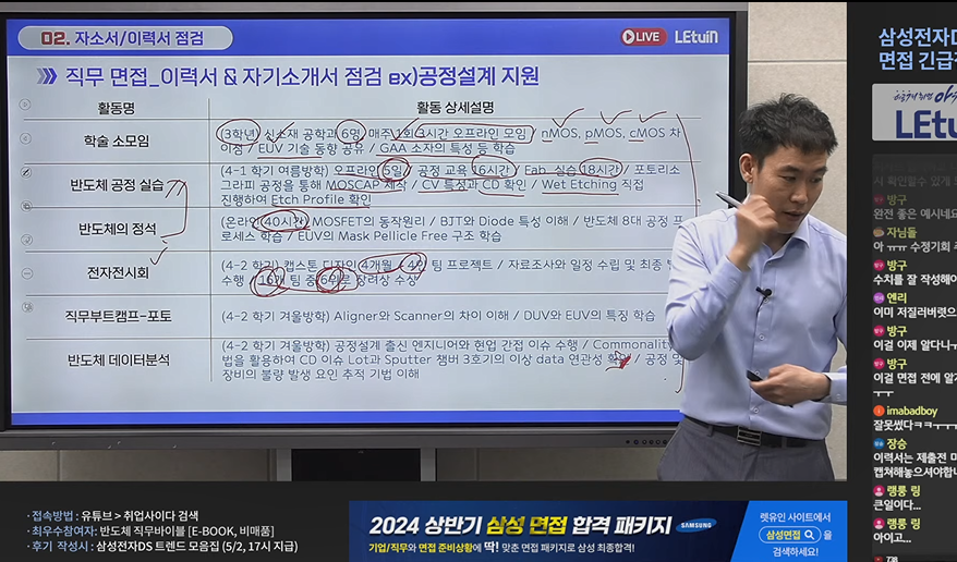 면접의 경우 어떤 자세를 가져야 하는지, 어떤걸 하지 말아야 하는지, 어떤걸 해야하는지 잘 알려주셨습니다. 또 각 직무별로 성격도 알려주시고 pt면접에 대해서도 예시로 잘 알려주셨습니다.