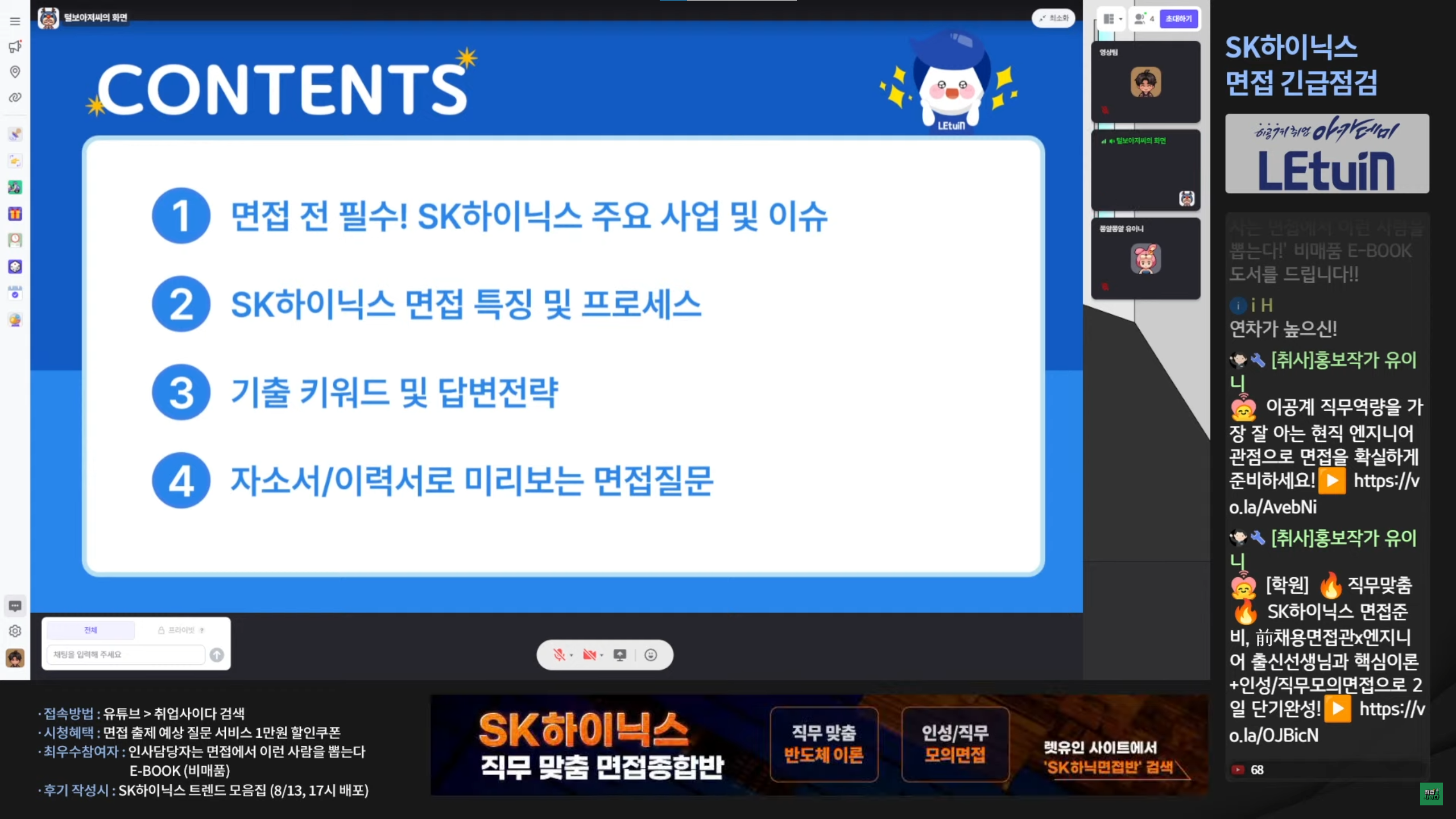 SK하이닉스 주요 사업 및 이슈, 면접 특징 및 프로세스, 기출 키워드 및 답변전략, 자소서/이력서로 미리보는 면접질문에 대해 말씀해주신 후, Q&A 를 진행했습니다. 질문이 있으면 진행 중에도 틈틈히 알려주셔서 궁금한 점이 있을 때 바로 해결할 수 있어서 좋았습니다.