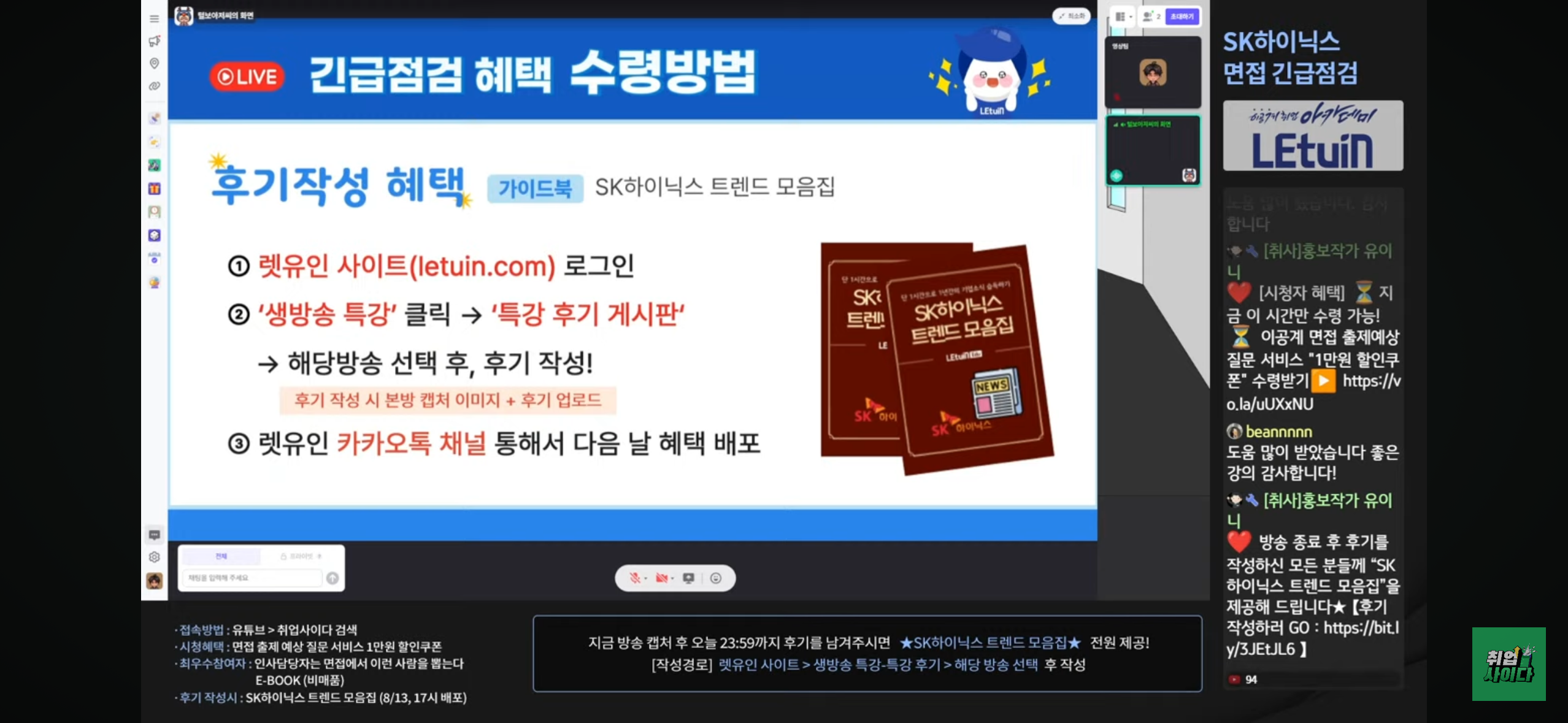Sk하이닉스의 현 사업현황 및 주력 제품에 대해 소개해주셨고, 이번 7월 수시채용에 올라온 직무볼로 어떤 역량이 필요하고 어떤 내용을 중점으로 면접을 준비하면 좋을지에 대해 전반적인 조언을 해주셨습니다. 또 마지막에는 질의응답 시간을 통해 해당 강의를 수강하는 분들의 질문에도 모두 성실히 답변해주셨습니다.