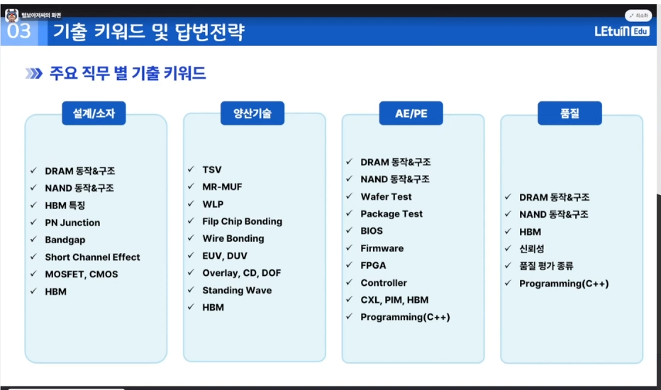 PIM, HBM, CXL 등의 sk 하이닉스에서 최근 영향을 끼치고 있는 기술과 제품에 대한 소개와 직무 면접을 준비하기 위해 준비해야 할 기술들에 대한 키워드를 잘 설명해 줘서 앞으로 sk 하이닉스를 지원할 때 준비해야 할 방향을 알 수 잇었습니다.