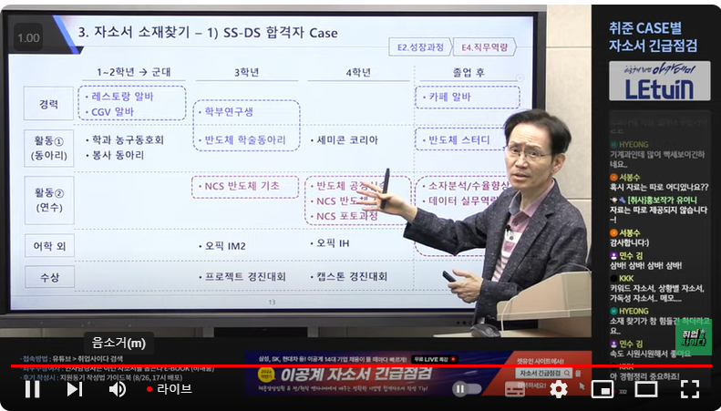삼성, 현대자동차, 하이닉스, LG같은 주요 대거업들의 자소서 문항과 상세 내용에 대해서 설명, 그리고 각 회사의 직무마다 작성 방법의 차이점에 대해서 구체적인 설명. 그리고 나서 Q&A를 통해 채용관련 상세한 질문에 대한 피드백 진행