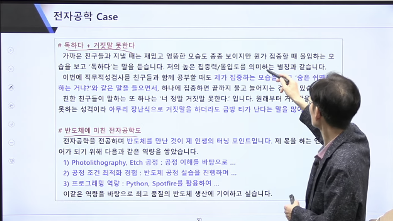 2. 내용을 분배하는 방법 3. 자소서를 쓰는 순서 들에 대해서 여러 자소서들을 초고와 수정본으로써 설명하였습니다. 가장 중요한 직무역량에 대해서 경험들을 어떻게 나열하고 써야하는지에 대해서 설명하셨습니다. 3. 수강후기
