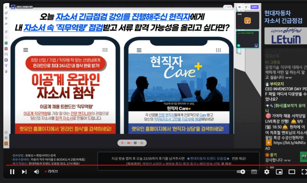기업에 재직 중이라 기업분석 및 자소서분석이 부족했는데 현직자분에게 들을 수 있어 간편했습니다.. 생방송 시청 인증 이미지