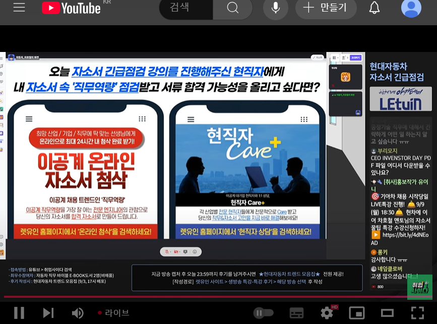 현대자동차의 2023년부터의 채용 트랜드부터 시작하여 전체적인 직무 설명, 자소서별 작성방법과 예시를 알려주셨습니다.