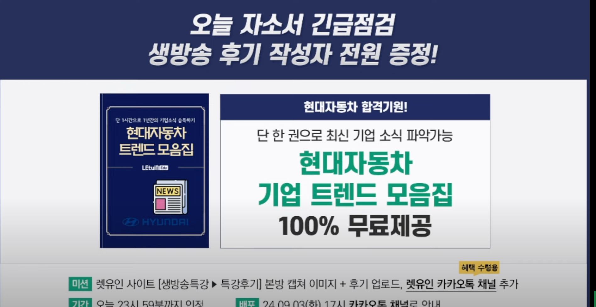트렌드쪽에서는 전동화 및 OTA와 ceo의 비전 pdf 가 가장 기억에 남습니다. 자소서 꿀팁에서는 취업 공고 읽는 법과 연계가 되는데 취업 공고(특히 경력자 공고)에서 키워드를 끄집어 내서 자소서에서 녹이기(이미 공개된 자료)를 잘 알려 주셨습니다. 3. 수강후기