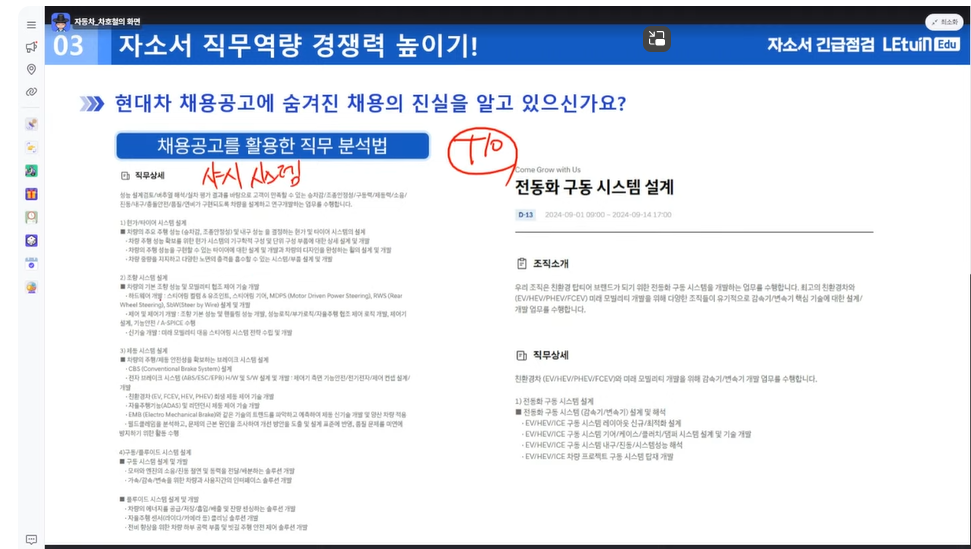 상품제안 개발계획수립 개발부품업체선정 차량디자인확정 수익성 협의 도면출도부품개발금형제작 개발차량시험/평가 품질확보 생산준비 양산 으로 나뉘는 프로세스를 전부 잘 이해하고 자소서에 녹일 것 3. 수강후기