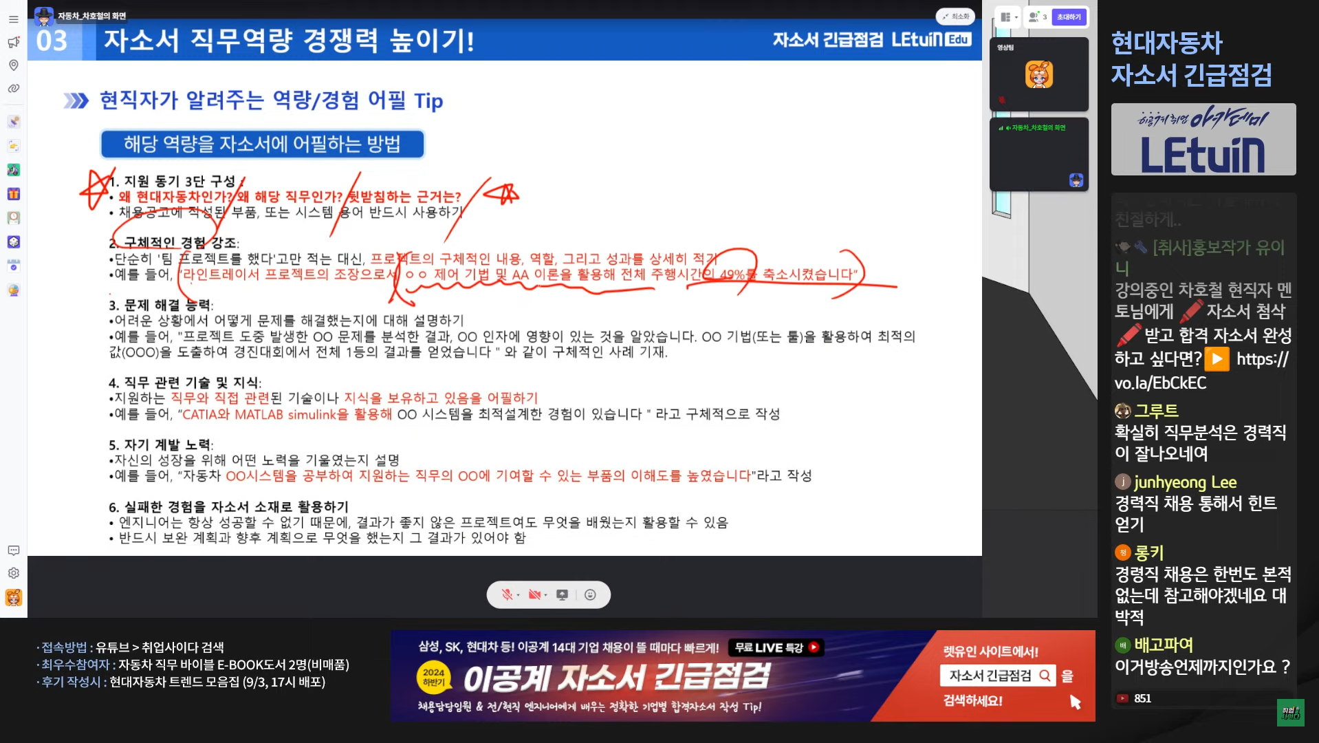 현대자동차 자소서를 쓰려고 할 때 막막함이 많았습니다. 설명회를 듣고 그 방향성을 잡을 수 있었습니다. 키워드를 핵심으로 본인이 무엇을 회사에서 하고 싶은지 명확히 밝혀 적는 것이 핵심이라 생각합니다.